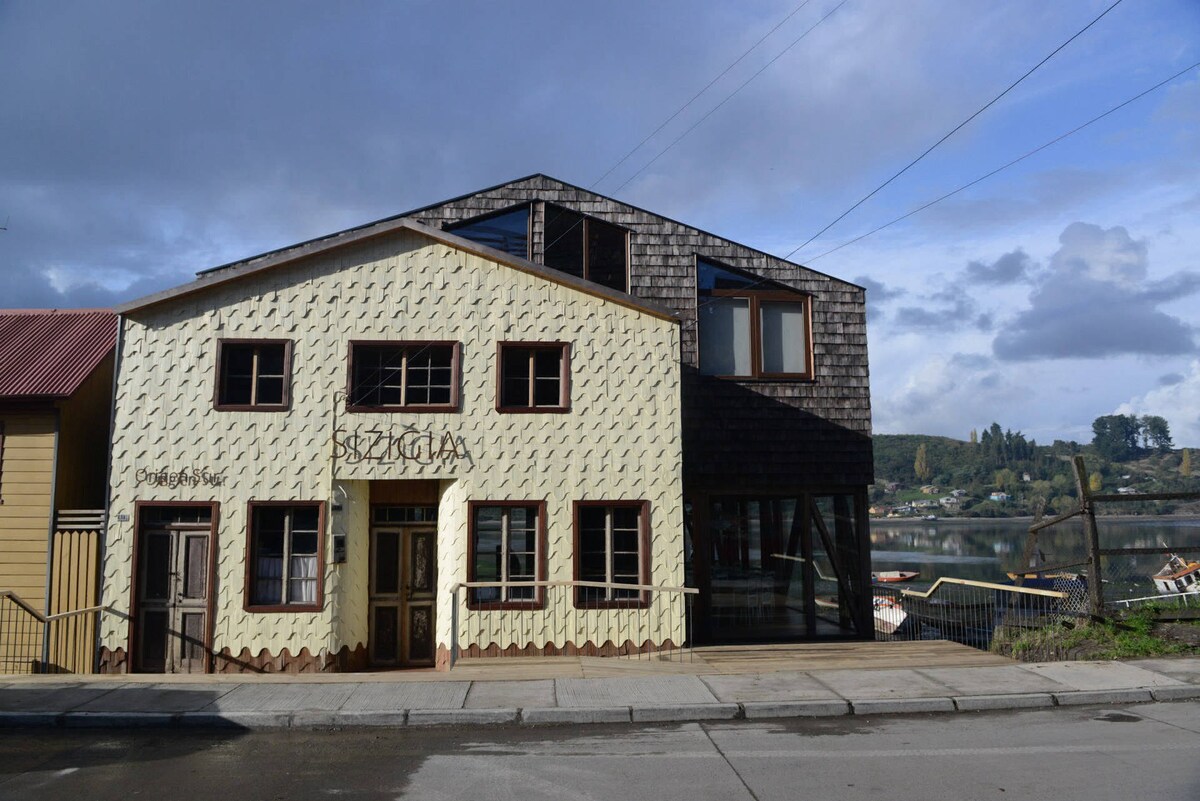 SIZIGIA Hotel es una construcción de madera donde se utilizaron las mejores maderas de la Isla (Mañío, Ulmo y Alerce), las cuales fueron cuidadosamente trabajadas dando como resultado la actual construcción que resalta y respeta la casa original de casi 100 años. La invitación a nuestros Huéspedes es que vivan la experiencia de un verdadero Palafito sobre el mar con todas las comodidades que les podemos ofrecer.