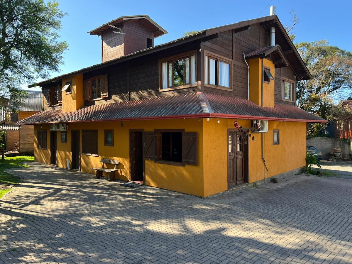Meie maja asub Serra Gaúcha kohal asuvatel põldudel 15 hektari suuruses maapiirkonnas, 8 km kaugusel Päikeseteest Vila Seca linnaosa kõrgusel. Ideaalne koht neile, kes otsivad rahu. Majas on 350 m2 suurune elutuba, kus on kamin ja söögituba, kus on puupliit, 4 magamistuba, 2 sviiti, puupliidi ja suure sahvriga köök ning mängutuba. Maja tagakülge ümbritseb kohalik mets. Maja ees on bassein ja jalgpalliväljak.