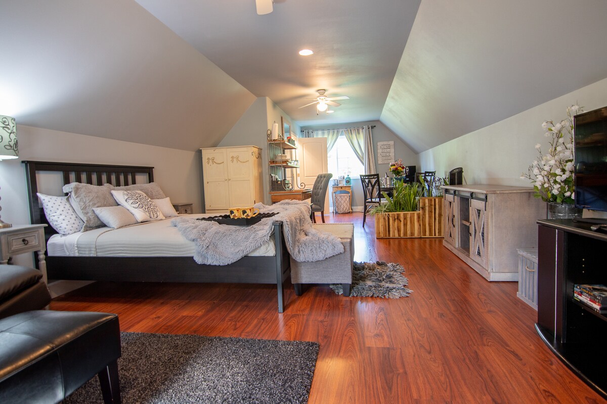 Meie väike maamaja on 280 ruutjalga koos oma sissepääsu ja parkimisega. See on kööginurgaasiga stuudio, kus on suur dušinurk. Meil on täissuuruses Murphy voodi kahele, samuti diivan. Meie bernedoodle, Alyena ja meie kassid on alati valmis sind vastu võtma. Koer on üsna häälekas, kuid väga sõbralik ja tahab, et viskaksid talle palli, eelistatavalt kogu päeva. Oleme saabumise suhtes paindlikud, lihtsalt saada meile sõnum.