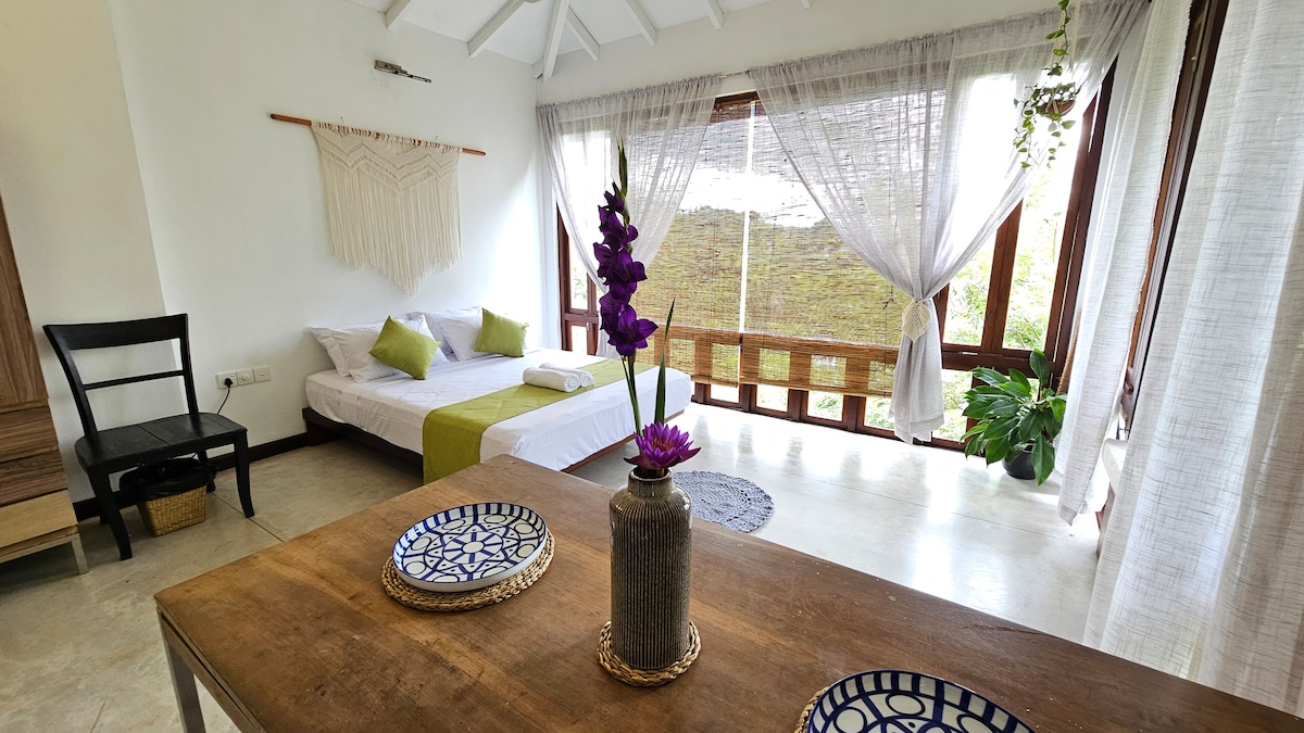 A private one-bedroom chalet surrounded by lush greenery, offering peace and tranquility, perfect for honeymoon couples and nature lovers. Just minutes from Pinnawala Elephant Orphanage and Ambuluwawa Tower. Features a private attached bathroom, in-house cook, and shared swimming pool with the main house and other chalets. Housekeeping is provided complimentary.