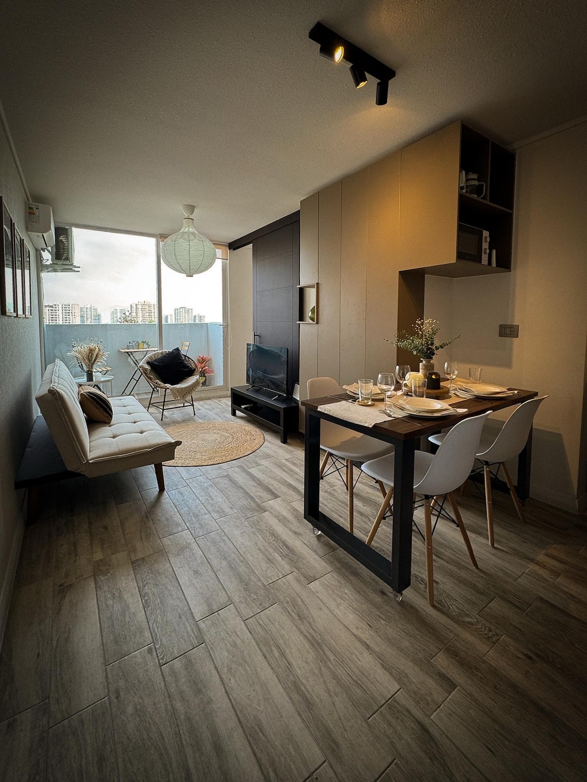 Acogedor y luminoso departamento con balcón, equipado con cama queen y un futón para un tercer huésped. Cocina Full Equipada Wi‑Fi 500 Mbps Smart TV Guarda‑equipaje gratis Pet‑friendly A solo 3 min del Metro Departamental, supermercados, restaurantes y cafés a pasos. Autopista Central a solo 5 min. Disfruta de gimnasio, quinchos y lavandería autoservicio en un edificio residencial seguro con conserjería 24/7. Ideal para parejas y estadías largas. ¡Reserva y vive Santiago como en casa!