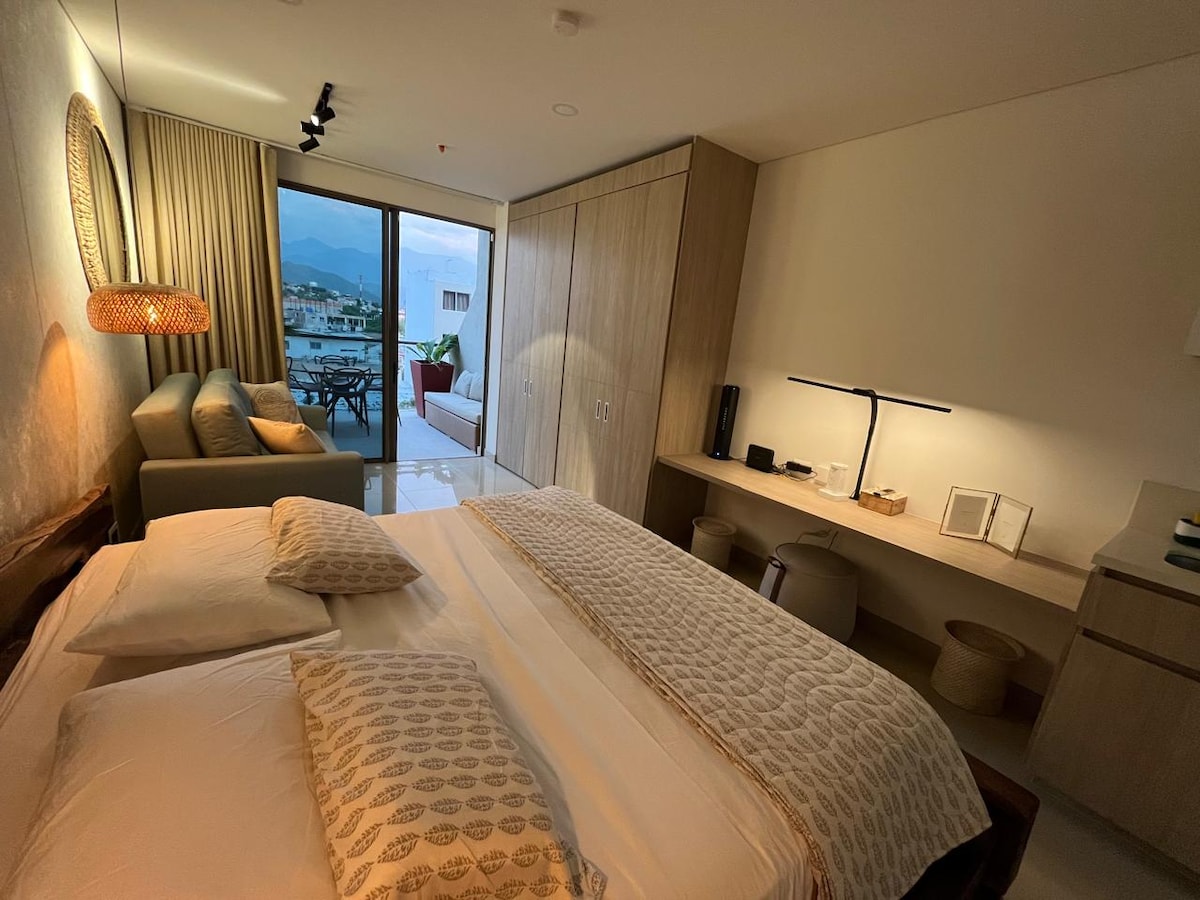 See 1 magamistoaga korter pakub mugavat peatumist, ilusat ookeanivaadet ja esmaklassilist asukohta Santa Martas, vaid mõne minuti kaugusel ajaloolisest keskusest. Seal on täielikult varustatud köök, Smart TV, WiFi ja privaatne rõdu koos välisöögialaga. Hoones on bassein, mullivann, jõusaal, saun, aurusaun ja ööpäevaringne turvateenus. Seda ümbritsevad restoranid, kohvikud ja lähedalasuvad ühiskontorid. Hoonesse ei ole lubatud külalisi, kes ei ole broneeringus.