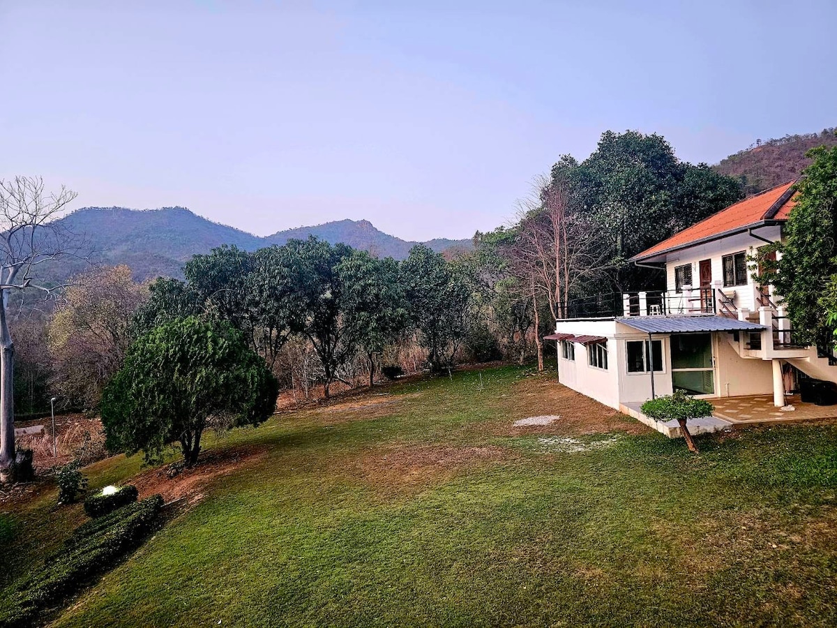 This 25-year-old house overlooks majestic mountains and features a spacious balcony with an outdoor cooking area. According to reviews, basic kitchen equipment is provided, allowing you to cook while enjoying stunning views and excellent air quality. It is located 2.5 hours from Bangkok and 50 minutes from Hua Hin. Driving a car is a convenient way to get around. If not, you can request a car with a driver for a daily fee. Cooking and learning Thai with the owner during a 1-week-long stay.