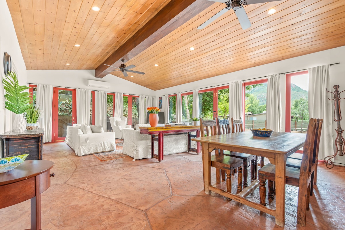Beautiful farmhouse on 8 acres in upper Ojai Valley. Perfect for a romantic getaway, a quiet place to write, or prime hiking retreat, with a beautiful private tennis/pickle ball/basketball court, BBQ and fire pit, laundry room, fully stocked kitchen with baking and cooking essentials. Books games and toys for children and adults to enjoy. TVs in both bedrooms. We invite you to enjoy the ultimate home away from home in a truly magical setting, beautiful Ojai Valley.