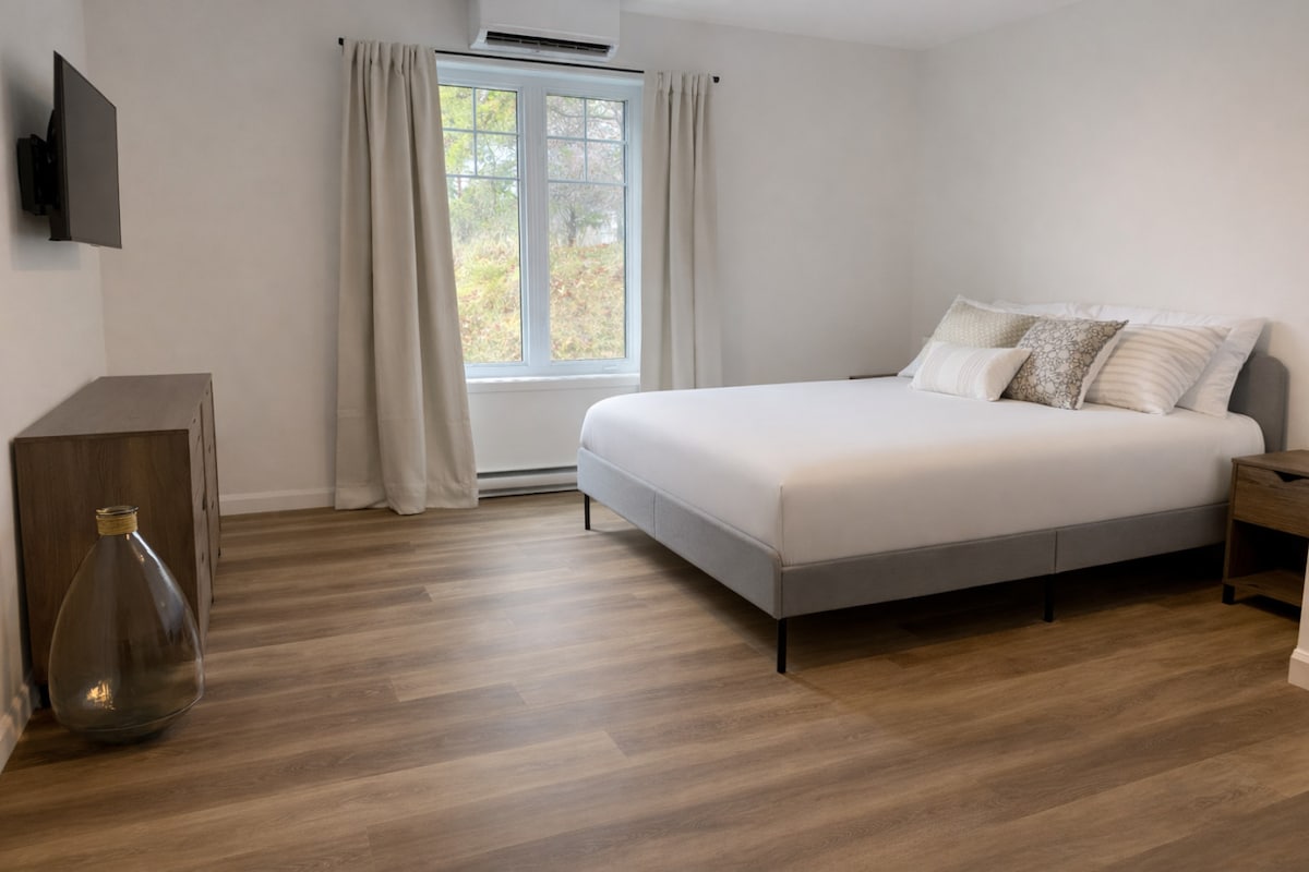 See trendikas konditsioneeriga majutuskoht pakub võluvaid nüansse. Värskelt renoveeritud majutuskohas on kaks hubast voodit ja diivanvoodi. Ruumi täiendavad privaatne vannituba ja söögituba. See väike stuudio annab sulle juurdepääsu soojadele ühiskasutatavatele aladele, nagu piljardilaud, soojendusega bassein, ilusad jõeäärsed ja bukoolilised jalutusrajad. Tule ja laadi akusid meie saarel, mis tervitab sind majesteetliku St. Lawrence 'i jõe südames.