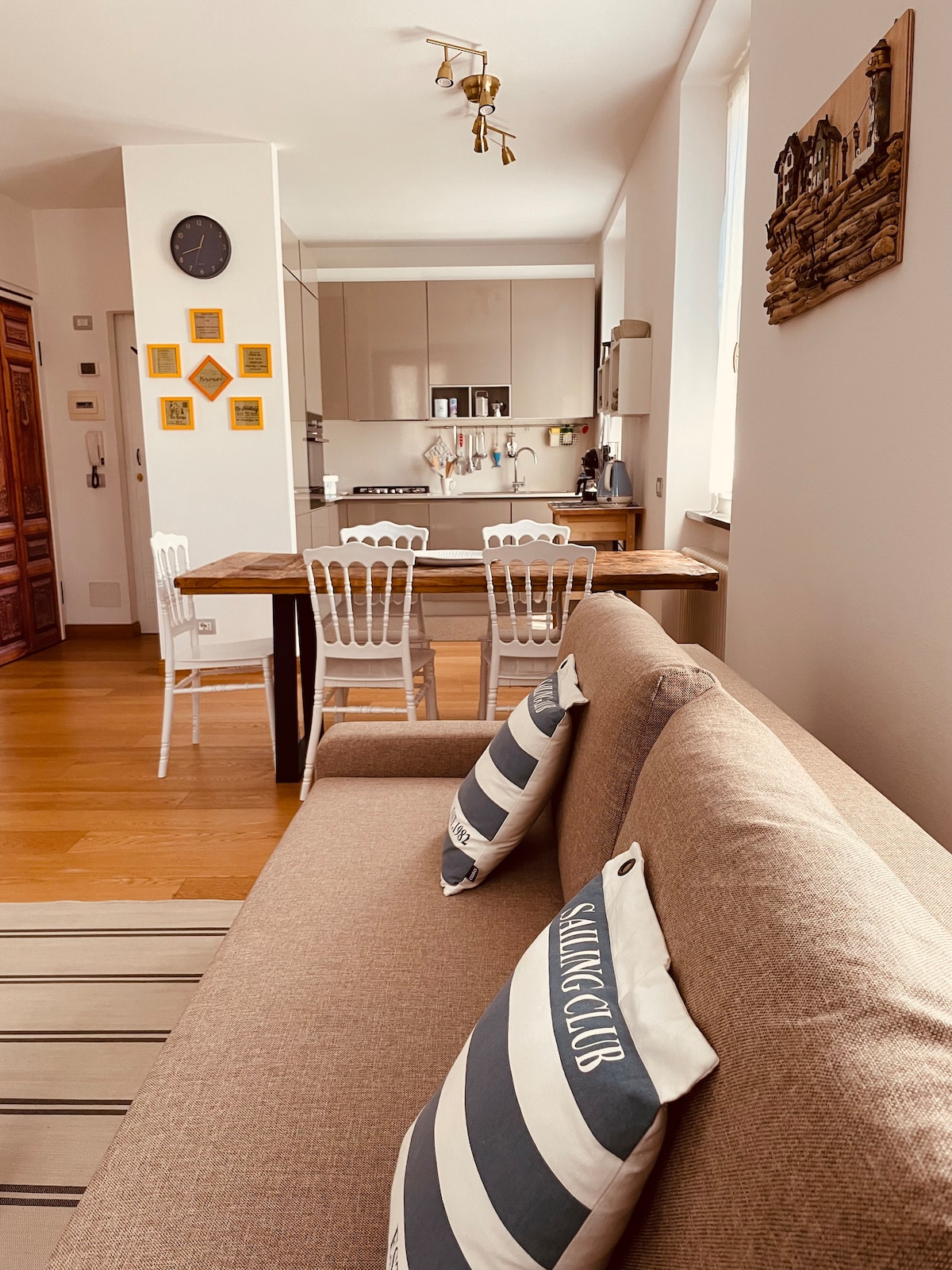 Grazioso appartamento in stile marinaro, al secondo piano (senza ascensore) a pochi minuti a piedi dal centro storico e dal lungomare di Chiavari. Un'ampia zona giorno - Wi-fi gratuito, smart tv e Netflix - cucina completa di elettrodomestici, angolo dedicato alla colazione con macchina del caffè - anche all'americana - bollitore, tostapane e microonde. Una camera da letto matrimoniale, un bagno completo di sanitari e doccia. Lenzuola ed asciugamani inclusi. Un parcheggio privato gratuito