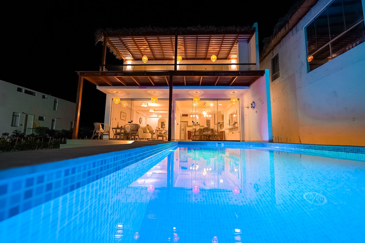 Bonita casa de playa en primera línea. Vista hermosa a toda la inmensidad del mar, desde la terraza, desde la cama y balcón principal, desde la cocina, desde la sala principal y sala de estar, desde la puerta cerca al bar. Relájate en un lugar tranquilo con brisa marina, cielo azul y sonido de las olas. Descansa en la hamaca, en las tumbonas Refréscate en la piscina! Internet Satelital Starlink, ideal para trabajo remoto, realiza videollamadas en HD (Zoom, Teams, Meet), toda la familia conectada