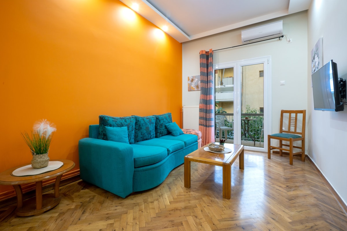 A newly renovated apartment conveniently located in the heart of Athens. Inspired by a love for Mid Century Design, every detail in this home has been carefully selected to provide a retro look with all the modern conveniences. Only a 3 minute walk to the nearest metro station and 4 stops away from Monastiraki Sq, you'll have easy access to all the must-see attractions of Athens.