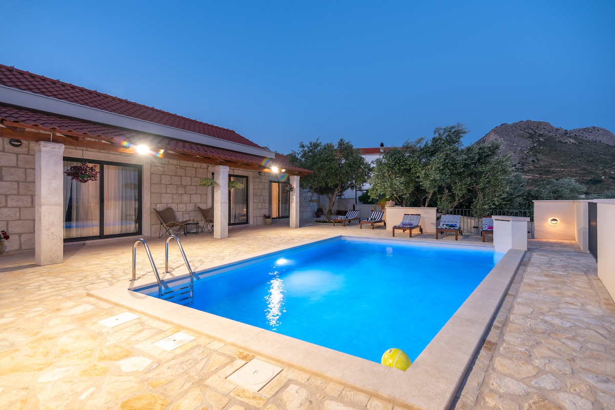 Majutus 8 inimesele privaatse basseiniga ainult 10 km kaugusel Spliti kesklinnast. Selles on 3 magamistuba, söögituba, elutuba, köök koos kõigi vajalike asjadega, 2 vannituba, kaks välisöögiala, grill, avar lamamistoolidega päikeseterrass. Korter on mõeldud puhkuseks, igasugused hilised peod on keelatud. Omanik elab ülakorrusel.