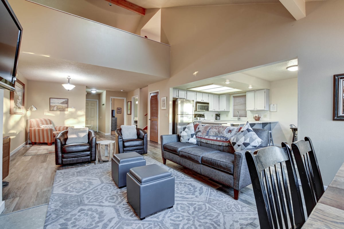 Puffin Place is a 320 sqft studio located two streets from the beach. Walking distance to Fresh Foods grocery and multiple restaurants. Vaulted ceilings, large windows, and neutral tones make the space the perfect combination of bright and cozy. On chilly days, curl up next to the gas fireplace and stream your favorite shows. The queen bed sleeps two guests comfortably. The sofa twin beds are best suited to youngsters. The condo is a third floor unit with stairs, no elevator.