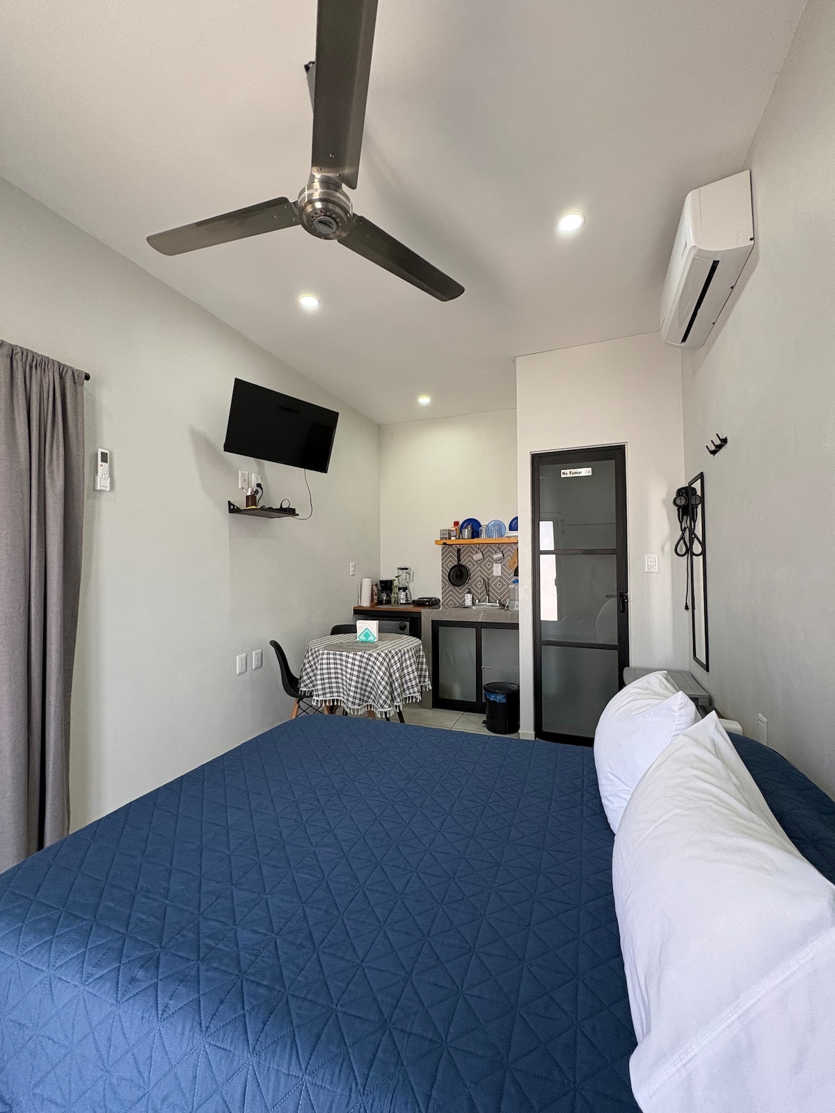 Esimese korruse 🏡 sviit | Ideaalne paaridele või Viajeros Solosele. Selles on eriti lai kaheinimesevoodi, kliimaseade, varustatud kööginurk, vannituba, elutuba ja privaatne terrass. Parkimine hoones. Suurepärane asukoht Blvd-s. Camino Real, Colima Ülikooli, valitsusasutuste, haiglate ja ostupiirkondade lähedal. Mugav, praktiline ja ideaalne puhkamiseks või töötamiseks. Olenemata sellest, kas pakud majutust üheks ööks või pikemaks ajaks, leiad siit ülejäänud, mida vajad.
