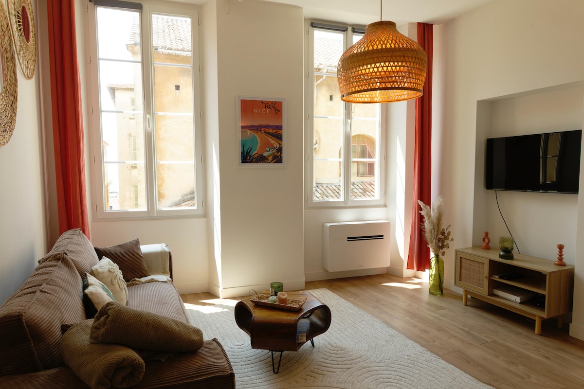 See ilus kahetoaline korter, mille pindala on 48 m2, konditsioneeriga, vaatega Nice 'i vana katustele, asub vanalinna südames asuva kaheaastase hoone liftita neljandal korrusel. Varustatud kõigi mugavustega, mis muudavad sinu reisi meeldivaks: kliimaseade, wifi, varustatud köögid jne. See on 4-minutilise jalutuskäigu kaugusel rannast ja 2-minutilise jalutuskäigu kaugusel Place Rossetist. See on ideaalne koht Nice 'i ainulaadse ja tüüpilise atmosfääri nautimiseks. Majutus koos lähedasega on ideaalne