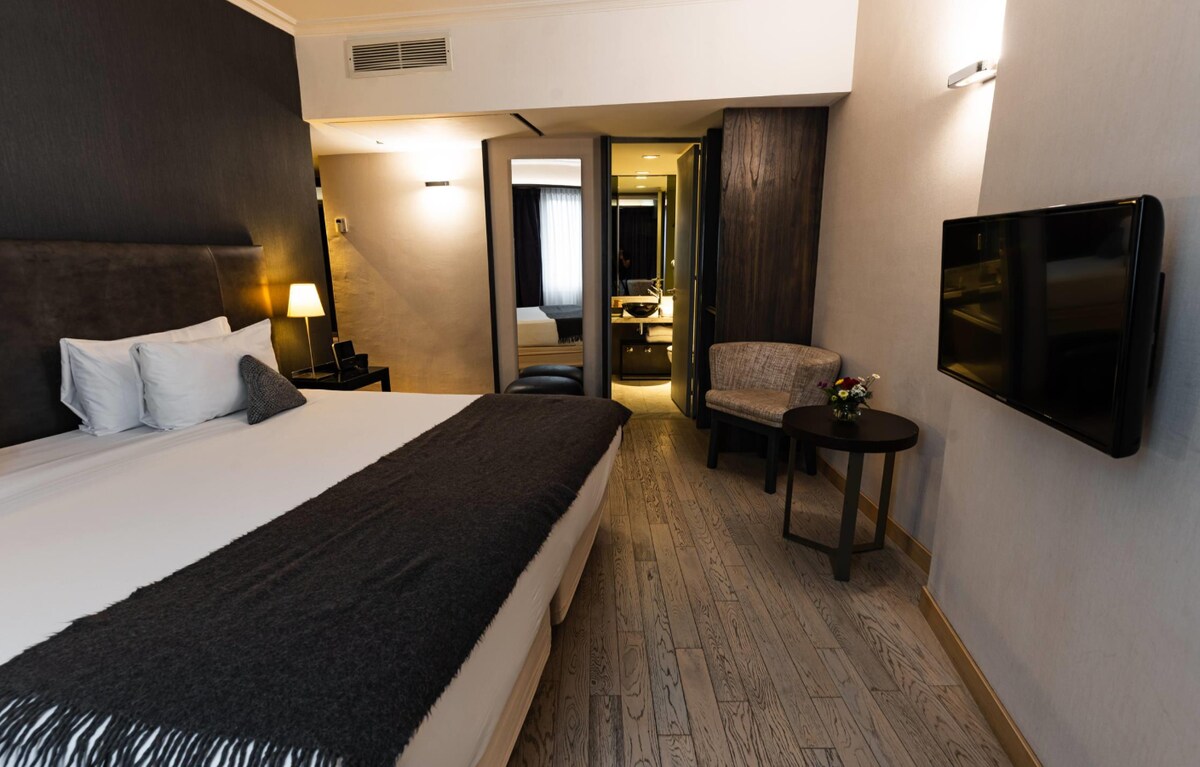 Bright and modern apartment at Hotel Ker San Telmo, located at Av. Colón 455. It features two twin beds, a desk, TV, air conditioning, safe, minibar, and electric kettle. The bathroom includes a bathtub, double sink, and premium amenities. Ideal for comfortable and functional stays in a central area, close to Puerto Madero, San Telmo, and Buenos Aires’ main attractions. Spacious and comfortable space. The hotel offers access to the spa, with sauna and massage services (additional cost).