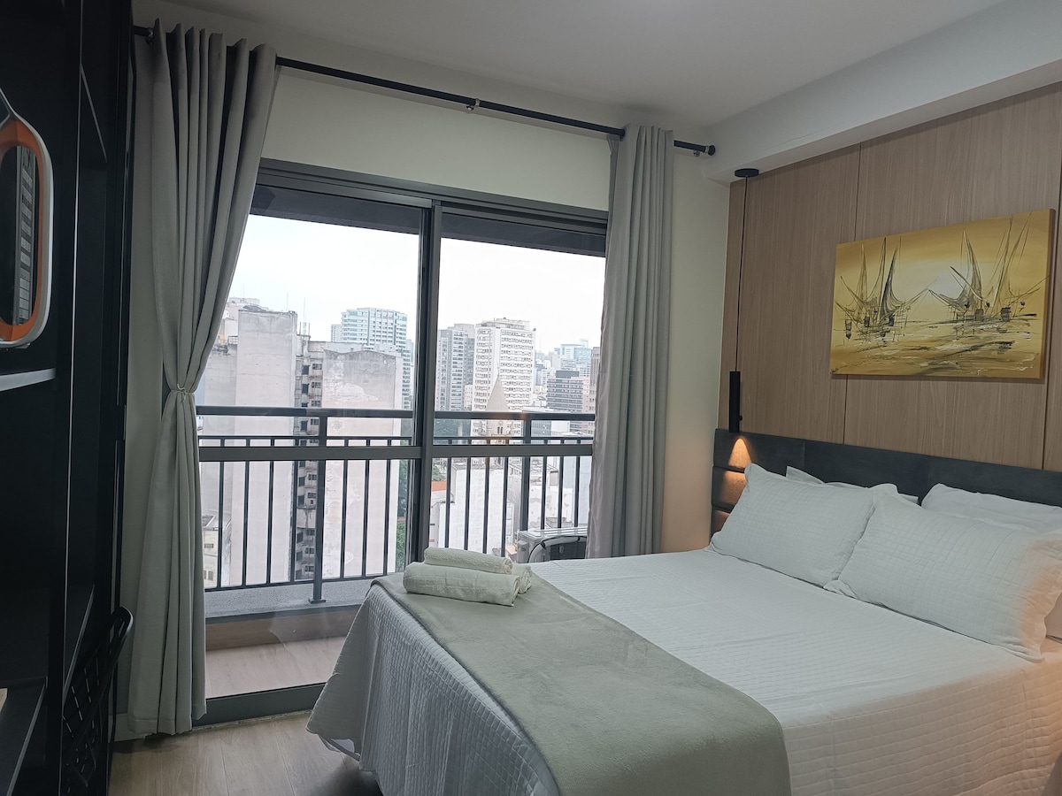 Espaço com todas as comodidades para estadias curtas ou prolongadas, tranquilo, completo e confortável, vista da cidade, sacada a céu aberto no 21o. andar de um edifício patrimônio arquitetônico dos anos 1950. Cozinha equipada, hidromassagem, Ar Cond quente/frio, água quente, TV QLED 50",enxoval fino completo, cama excelente, espaço de trabalho com internet Starlink, Echo-dot Alexa, este é um lugar especial para trabalho ou lazer, para renovar suas energias e estar perto de tudo em S. Paulo🥂