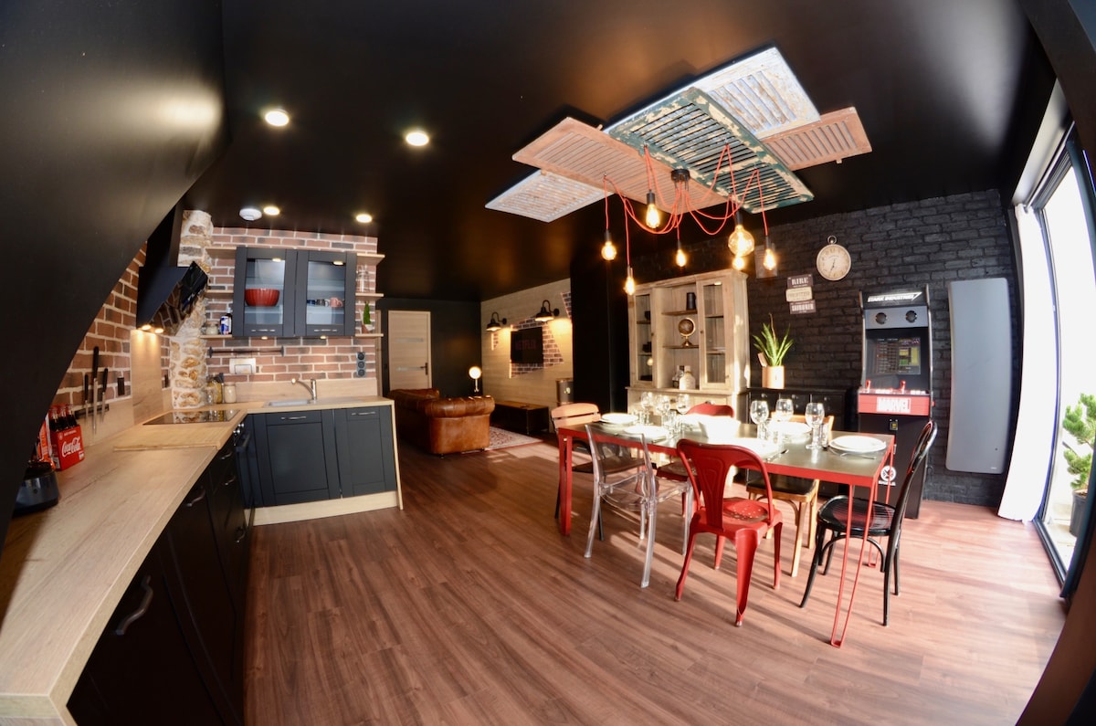 Ce logement de 60 m² au design unique, idéalement situé à proximité de Disneyland Paris, La Vallée Village et Paris, peut accueillir jusqu'à 6 personnes. Profitez de nombreux équipements pensés pour votre confort : parking privé juste devant le logement, terrasse aménagée, cuisine entièrement équipée, connexion fibre et même une borne d'arcade pour des moments de divertissement inoubliables. Installez-vous, détendez-vous et laissez la magie opérer… Maxim s'occupe du reste !