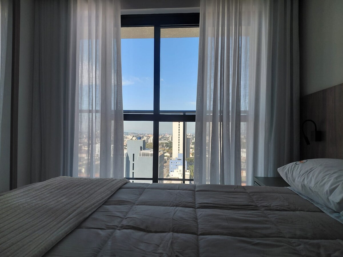 Selles laitmatus 35 m2 dupleksis stuudios saad nautida mugavust ja praktilisust. Asub Ecoville 'i südames. Ideaalne paarile, väikestele peredele või juhtidele. Magamistoa voodipesu ja rätikud. Interneti WIFI 600 MB, NETFLIX. Ampla balada grilliga, ilus vaade loodusele. Sellel on 02 teleri Smart 43" ja 32". Privilegeeritud asukoht: ostlemine Barigui, pargid, restoranid, pagariärid, apteegid, kohvikud, PUB-id, turud. Ainult 5 km kaugusel Curitiba kesklinnast. Isikupärastatud teenus enne peatumist ja selle ajal.