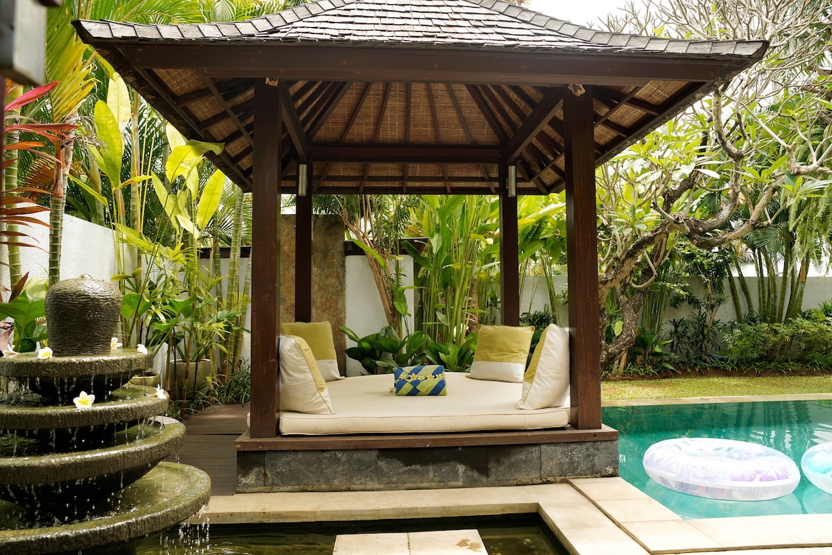 Frangipani Kuning Private Villa, täispersonaliga villa Berawa Canggu südames. ✔ Luksuslikud King-klassi magamistoad, kus on konditsioneer, nutiteler Netflixi ja kaabeltelevisiooniga ✔ Sooja veega vannitoad ✔ Bluetooth-kõlar 2,5 ✔ m x 3 m bassein ✔ Täielikult varustatud kööginurk ✔ Jalutuskäigu kaugusel 3 min rannast, Finns klubist, Atlas klubist, supermarketist, poest, restoranist jne ✔ Kiire kiudoptiline wifi ✔ Igapäevane tasuta koristamine regulaarsete linade ja rätikute vahetamisega. ✔ Ööpäevaringne turvatöötaja