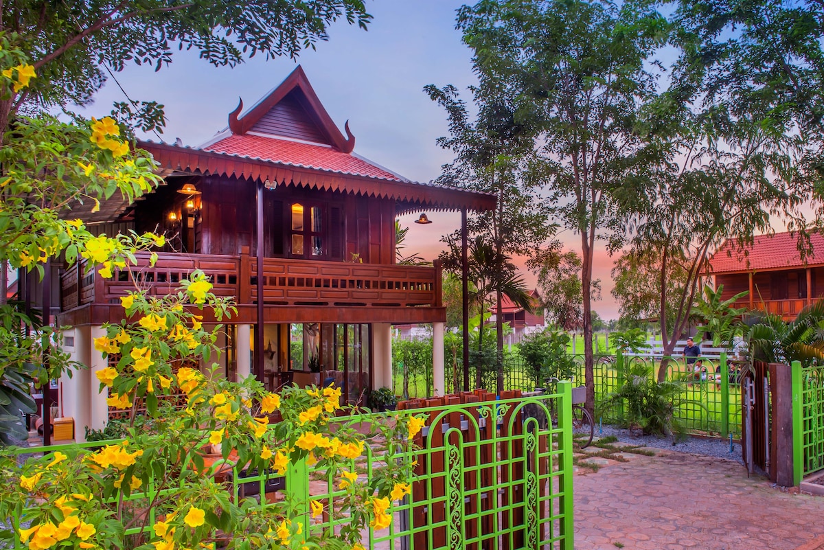 Lõõgastu ja unusta maailm selles rahulikus rohelises kodumajutuses, kust avaneb vaade riisiväljadele Siem Reapi äärelinnas. Mine magama armsas puidust ja konditsioneeriga magamistoas ning ärka üles värskelt pruulitud kohvi ja hommikusöögiga oma terrassil, kust avaneb vaade riisipõldudele. Sul on täielik privaatsus ja kogu majutuskoht on sinu päralt, kuid sinu majutajad on lähedal kõige jaoks, mida vajad. Ideaalne majutuskoht Siem Reapis!