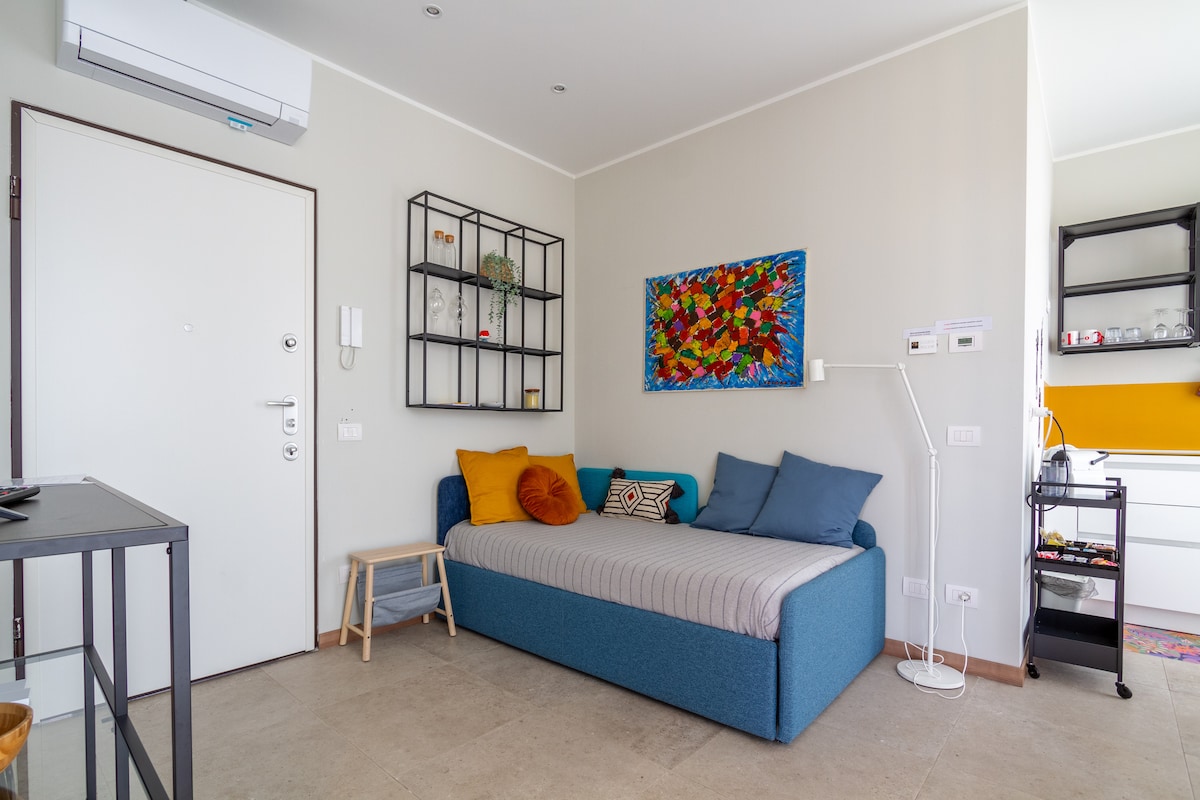 Stuudiosviit/disainisviit Naviglis, kiviviske kaugusel San Lorenzo sambadest, mis on renoveeritud arhitektide peene viimistlusega. Asub väärikas palees, kust avaneb vaade vaiksele ja võluvale sisehoovile. Suur ja varustatud köök, eraldi magamiskohast. Voodi, mida saab muuta üheinimesevoodist kaheinimesevoodiks. Nutikas tööala, suur kadunud garderoob, suur aknaga vannituba. Kliimaseade. WiFi-ühendus. Teler puudub Riiklik isikukood: IT015146C2GP9RRCAR