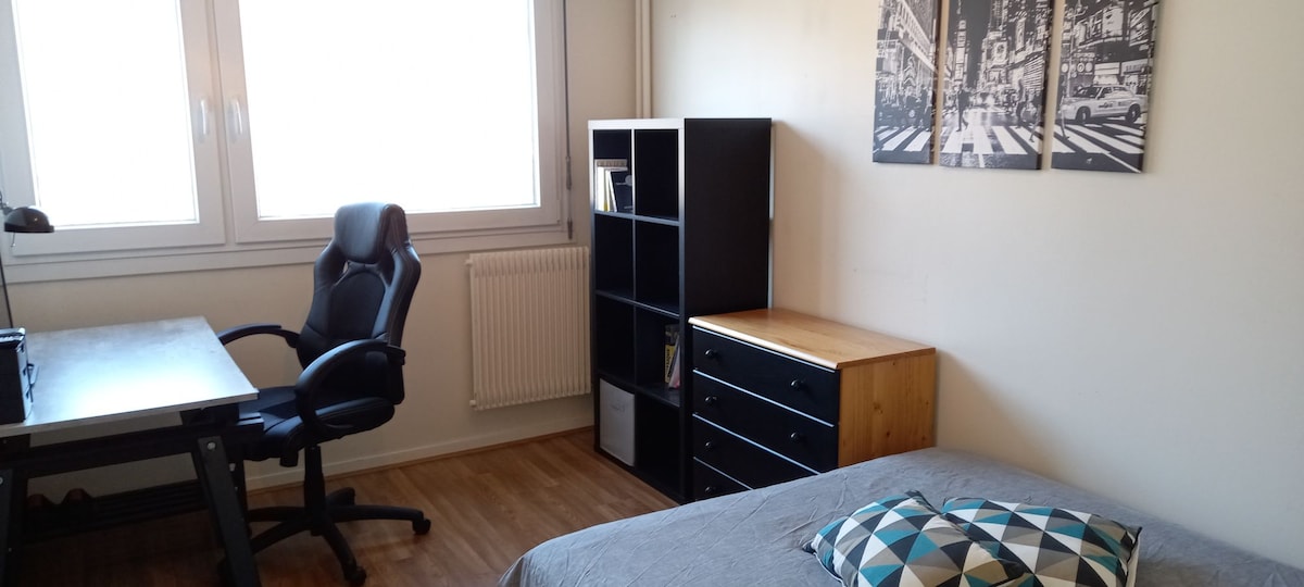 Bonjour, Nous vous proposons une chambre privée AVEC verrou dans un appartement à partager avec d'autres voyageurs. La chambre possède : lit double, bureau, chaise et rangements. Les draps sont fournis (pas de serviette !).. L'appartement équipé est entre campus universitaire et du centre ville/Gare A proximité : transport en commun (tram C, bus) commerces (supermarché, pharmacie, tabac, boulangerie) et stationnement gratuit. Arrivée possible À PARTIR de 17h (aucune arrivée avant possible).