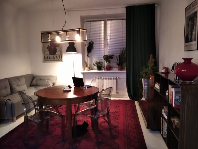 Ilus vaikne korter vanas Mokotówi tüüpi stuudios, kus on avatud ruum ja vaated aedadele. Korter asub 3 minuti kaugusel Racławicka metroojaamast, kust jõuad Varssavi kesklinna 10 minutiga. See on varustatud kõigi lühi- või pikaajaliseks peatumiseks vajalike vahenditega. Koridoris on ruumikas kapp. Mänguväljak ja raamaturiiul ootavad. Võid iga päeva alustada kohvi või teega, mis sind köögis ootab. Loodan sind tervitada