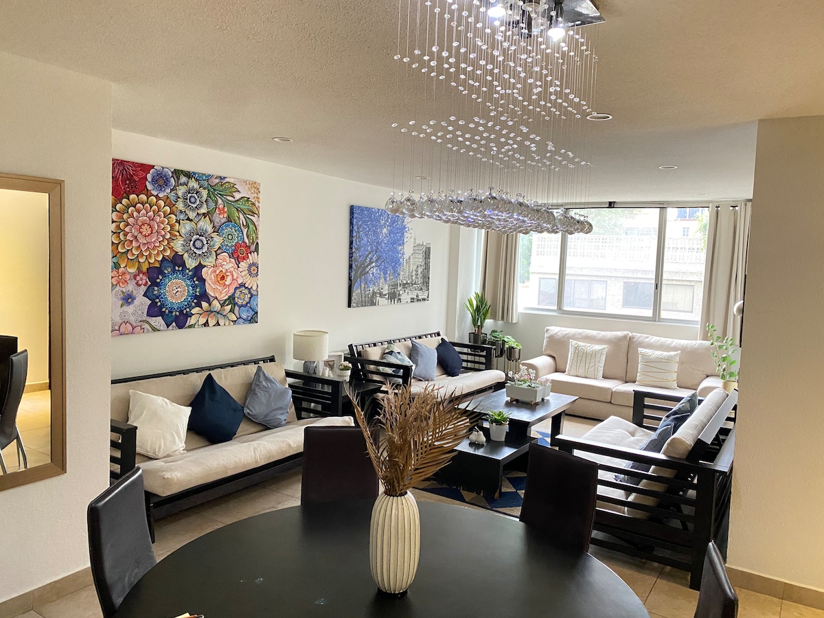 Elegante luminoso e encantador departamento céntrico con vista exterior , hermosa zona vigilancia 24 horas, Muy cerca Colonia Condesa, Colonia Roma, y Coyoacán.bonitos parques, super mercado, restaurantes, centros comerciales, cines, transporte publico a cinco minutos caminando. Renta de Eco bici, Cuenta con 2 recamaras, 1 baño 1/2, sala, comedor, cocina equipada, lavadora, secadora. TV con cable e Internet. Muy cerca de la zona de hospitales, 20 de Nov. A tres cuadras caminando