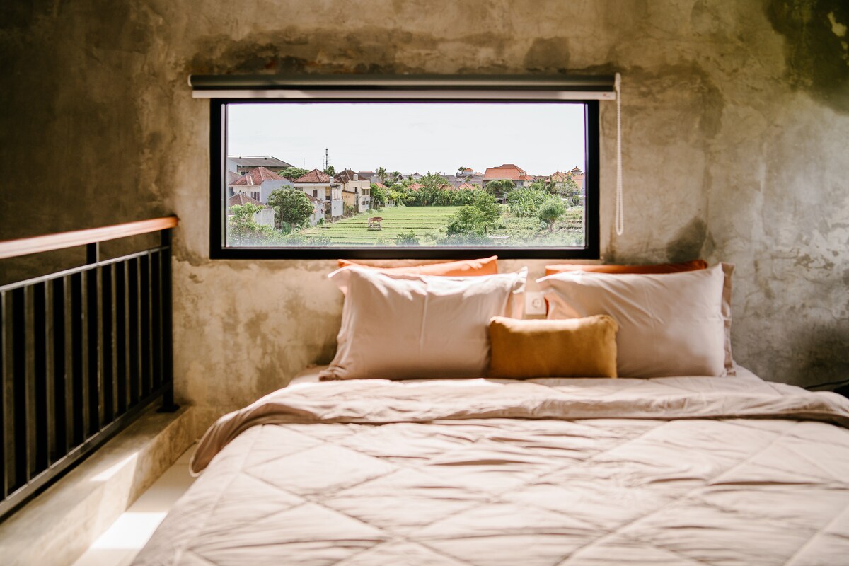 Welcome to your stylist industrial loft — perfectly located between Seminyak and Canggu. What You’ll Love: • Stylist industrial design, with warm & natural light • Cozy bedroom with rice field & mountain views • Shared pool & sun loungers • Fast Wi-Fi & smart TV • Compact kitchen & dining space • Dedicated working desk • Adults-only – ideal for solo travelers, couples & long-stay nomads Make this your peaceful Bali home—reserve your stay today. 🌸