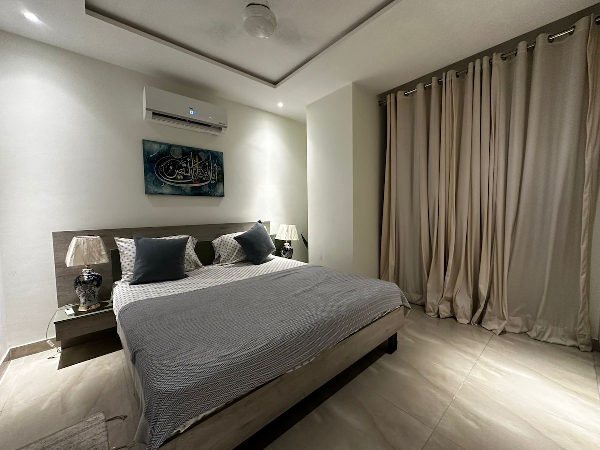 Luksuskorter DHA 8. etapis, vaid mõne minuti kaugusel Lahore 'i lennujaamast. Ideaalne peredele, ärireisideks ja pikaajaliseks peatumiseks. Naudi kiiret WiFi-ühendust, varuvõimsust, turvalist parkimist, lifti ja täielikult varustatud kööki, kus on tasuta tee, kohv ja suupisted. Jaluta poodide, restoranide ja DHA spordikompleksi juurde. Ööpäevaringne turvalisus meelerahu tagamiseks. Puhas, vaikne ja mugav! Broneeri kohe, et pakkuda lennujaama lähedal sujuvat ja stressivaba peatumist!