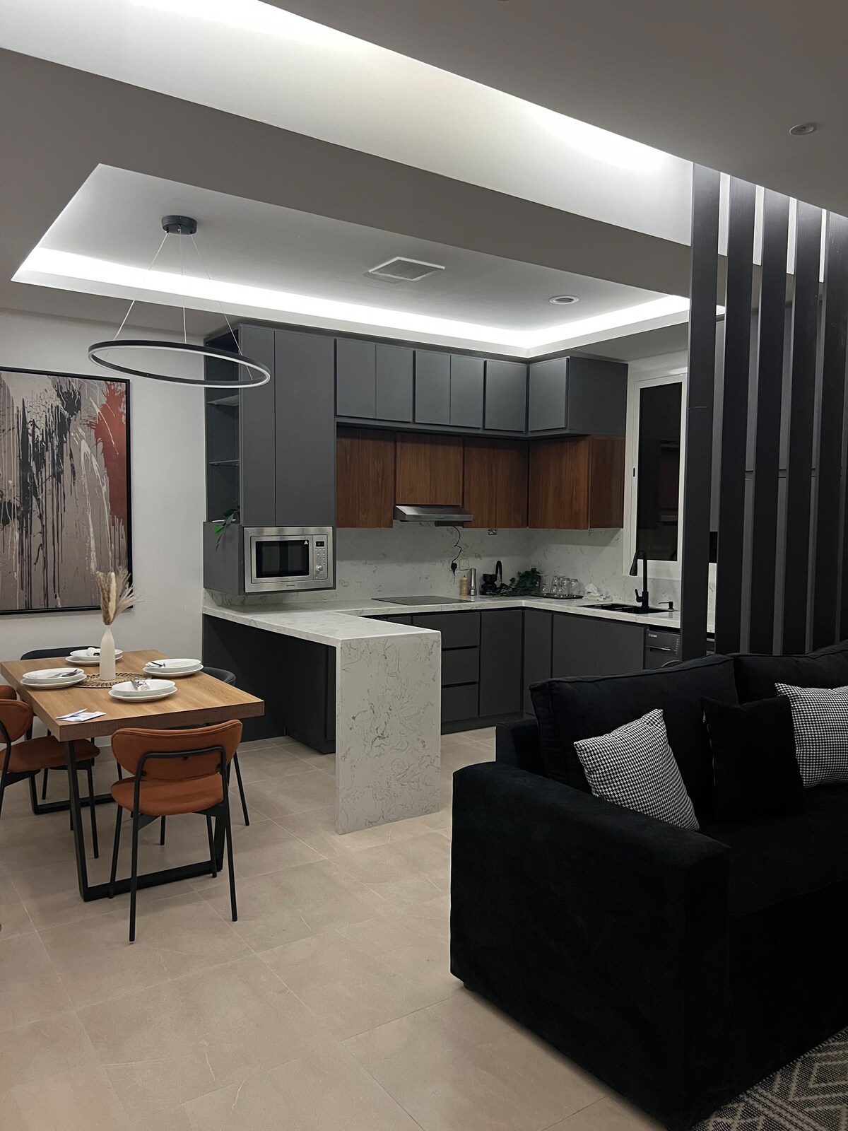 Lõõgastu selles vaikses ja stiilses majutuskohas peenes naabruskonnas Ja naudi mugavat ja integreeritud kogemust, kus majutuskohas on: - Lihtne juurdepääs tipptasemel kohvile, Misk Charity Walkile, toidupoele, pesule. - Selle lähedus Riyadhi hooajaga ja King Khalid Roadiga kaasnevatele üritustele ning selle lähedusele diplomaatilisele kvartalile. - Iseseisev sisenemine - avar puhketuba, mis on avatud köögile ja söögilauale - Tasuta väliparkimine hoone ees - 70-tolline kvaliteetne ekraan lõbusaks vaatamiselamuseks + Netflixi tellimus Pesumasin 7 kg 100% kuivatamisega