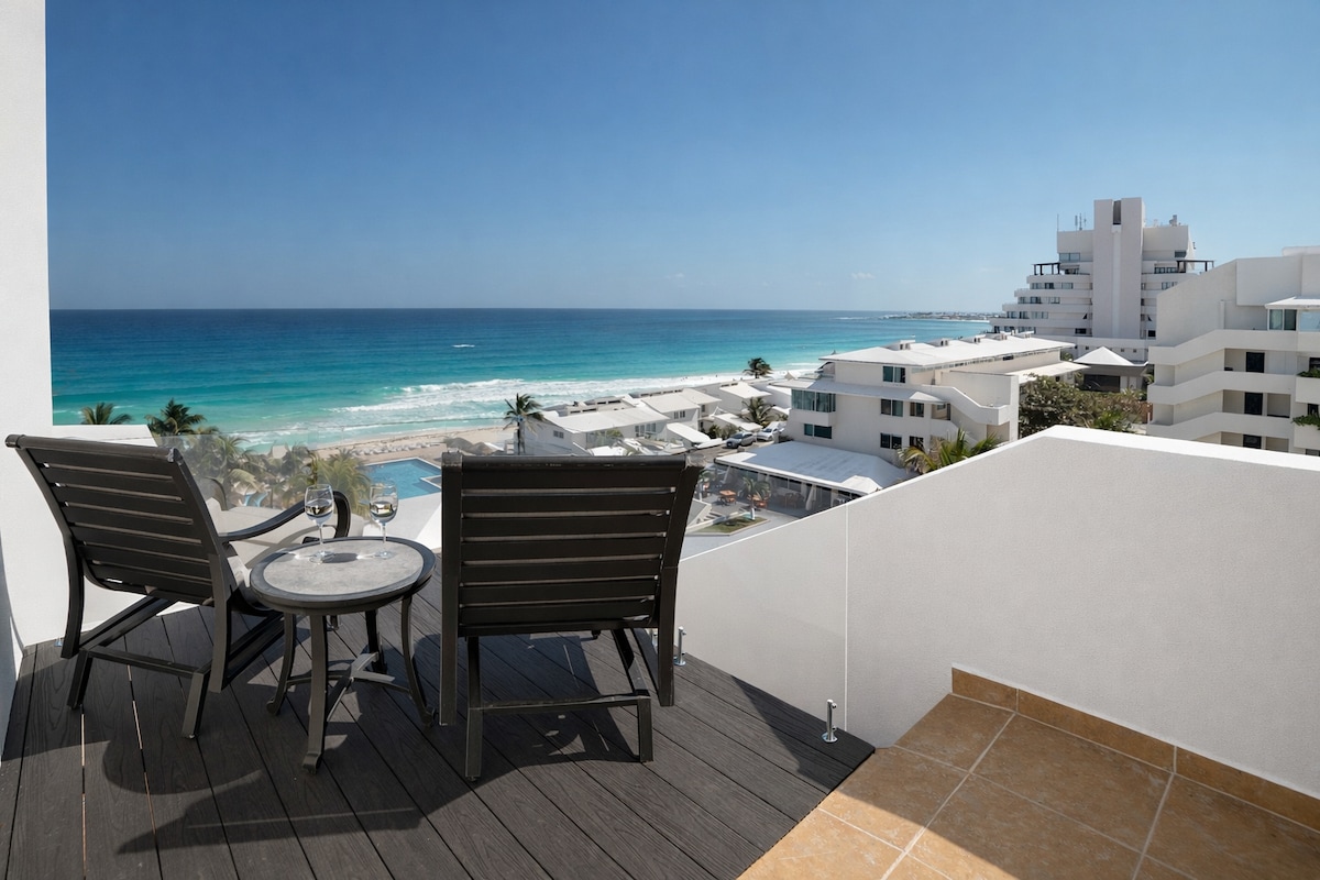 See 270-kraadise rõduga Deluxe nurga sviit asub ühes Cancuni kõige ilusamas rannas ja pakub isegi vannitoast avaneva suurepärase panoraamvaatega rannaliin ja ookeanivaatega. Ainulaadne konfiguratsioon, mis võimaldab hommikul oma korteriterrassilt nautida hingematvat päikesetõusu rannas.