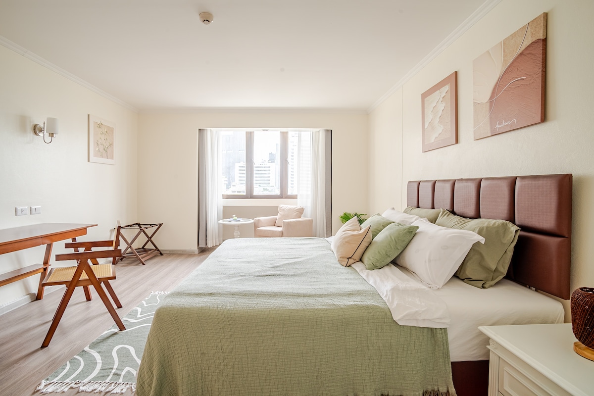 Tervita külalisi kõigilt elualadelt BUA Residence'is, mis kuulub ROSELYN Boutique Collectioni. Jalutuskäigu kaugus: ☞ 3 minutit Nana Plazani ☞ 5 minutit Benchakitti metsapargini ☞ 7 min Nana BTS-i ja Sukhumvit 11 söögikohta/ööelu ☞ Lihtne juurdepääs Bumrungradi haiglale ja QSNCC-le Mugavused: ✔Bassein ja jõusaal ✔Kiire wifi ✔Mugavad voodipesu ✔Nutiteler ✔Kapselkohvimasin ✔Plaadimängija ja Bluetooth-kõlar ✔Mänguautomaatide mängud ja konsool ✔Ööpäevaringne esmatarbekaupade pood ✔Uksehoidja ja ööpäevaringne turvalisus Pärast iga peatumist puhastatud ja desinfitseeritud.