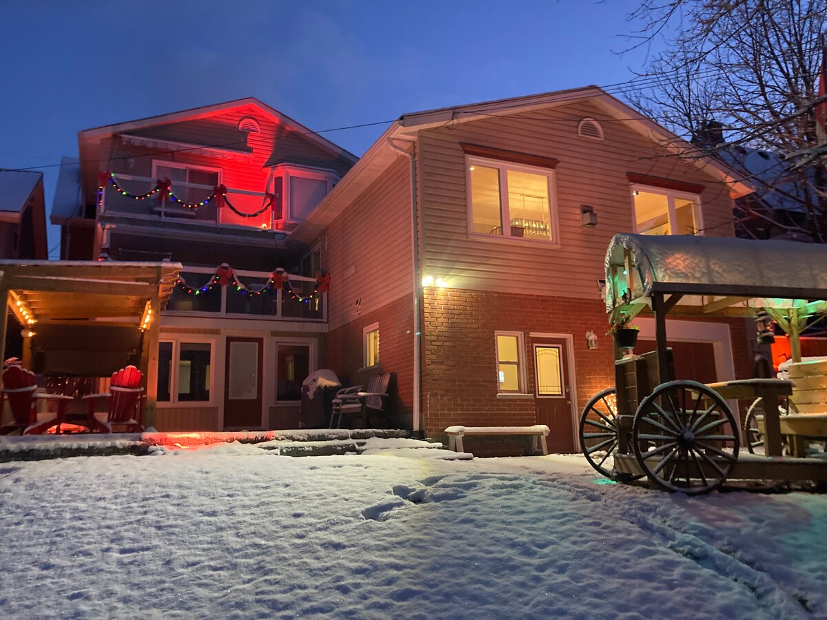 Our place is on the Trent Severn Waterways and near down town shopping. Great for biking,kyaking, pubs and restaurants. Our suite is equipped with one bedroom with fireplace ,TV and ensuite with jacuzzi. There is a kitchen and dining area, living room with TV and fireplace. Free Wifi. There is also laundry facilities, Hot tub ,sauna and outside patio with propane fire pit and barbecue, all for your private use. We are setup for a couple and our amenities are for our guests only .