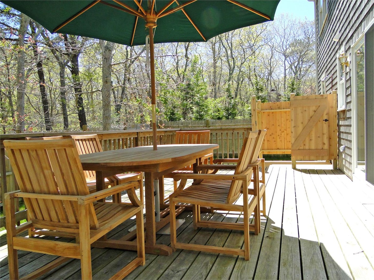 Contemporary cottage on quiet, private, wooded lot. Pristine, bright & comfortably furnished. Open living area, hardwood floors, vaulted ceilings, indoor/outdoor fireplaces, well appointed kitchen, washer/dryer, cable/internet/phone with unlimited national calling, SmartTV with Netflix and additional internet streaming services. Walk or bike to beaches and trails, 5 minute drive from downtown shops and restaurants. Property abuts West Chop Woods with lovely, quiet walking trails.