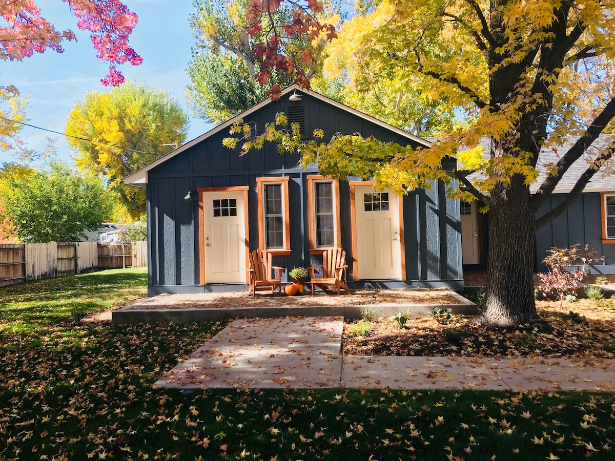 Eastside Guesthouse is a boutique hotel in the heart of Bishop, CA. Each room has a private outdoor entrance, this room has a queen bed, private bathroom with either a tub or shower (please message or call us if you wish to specify if you prefer one over the other, we cannot guarantee availability of your preference so please check with us). It also includes some shared spaces, including the kitchen, community room, and outdoor spaces.