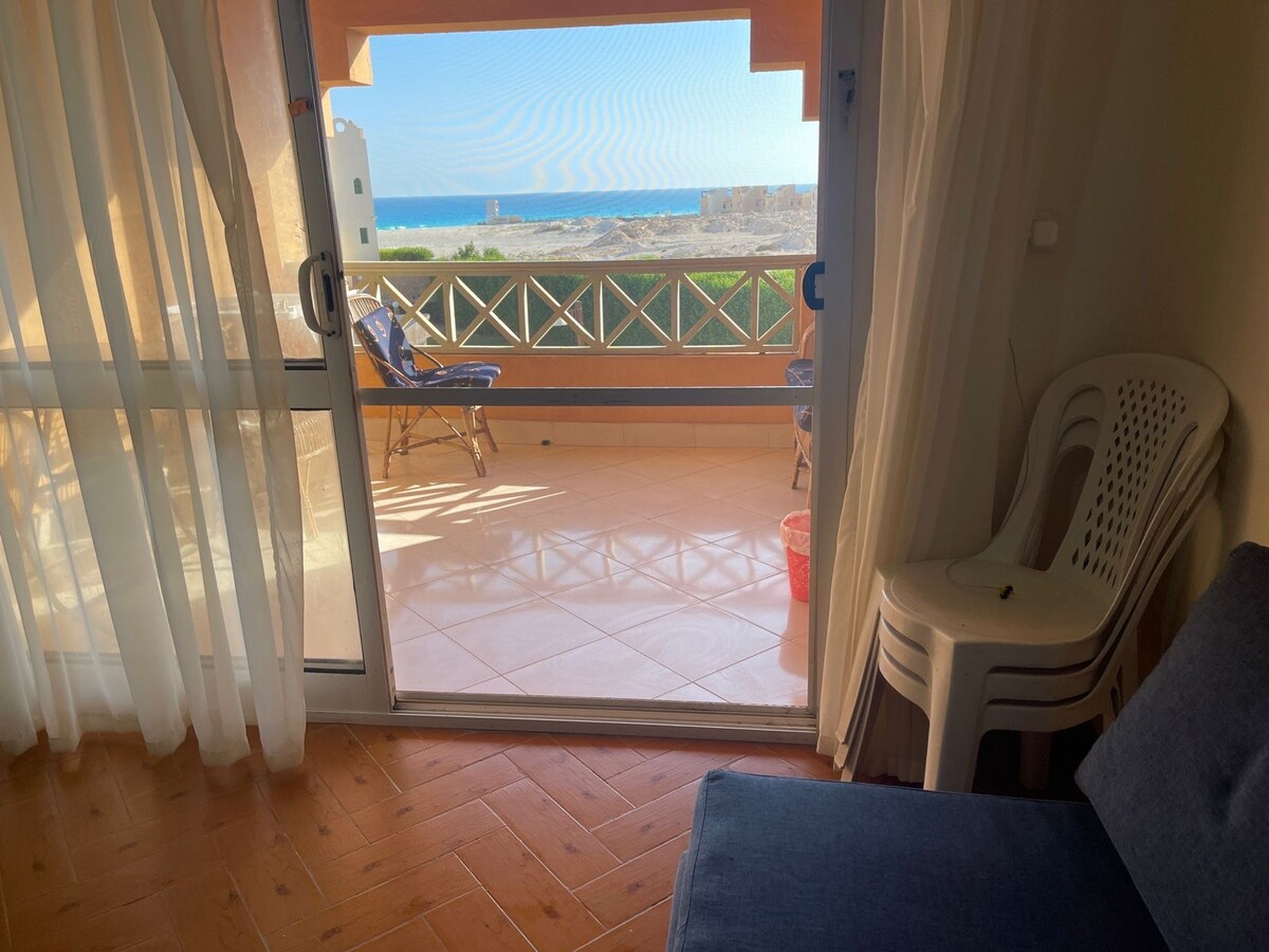 Our spacious, relaxing, simple, and charming two levels apartment in Marina north coast has a unique lake, and sea view..The apartment is close to the markets and seagull restaurant. 3 mins from porto. It is on the 3rd floor. It has 5 beds and another 2 mattresses. A balcony, a big terrace, fully equipped kitchen, 2 bathrooms with shower cabins, satellite, ACs in bedrooms.