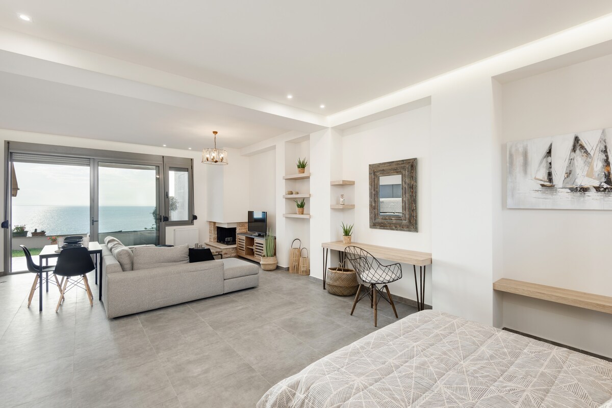 Mereäärne maja asub vaid 30 km kaugusel SKG lennujaamast ja 1 km kaugusel Nea Irakleia kõrtsid ,super turg, apteegid, restoranid ja kuulsaim rannabaar Chalkidiki.Kvaliteetses korteris 8 korterit mäenõlval pakub suurepäraseid vaateid Aegan mere ja Olymp mägi.Korter teisel korrusel on recenlty renoveeritud privaatne parkimine ja trepikoda randa.