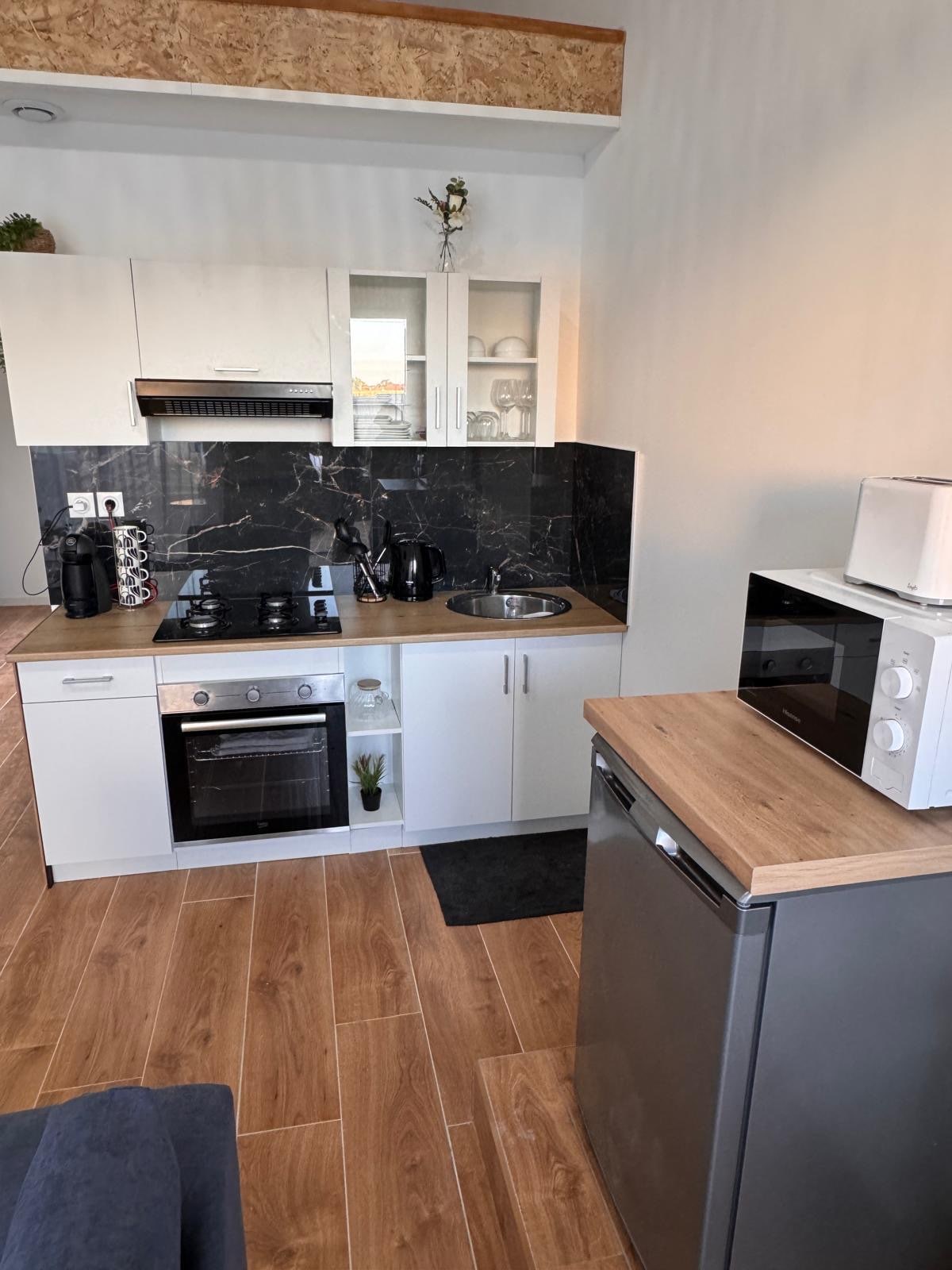 Tõeline lõõgastuskookon, vaid 6 minuti kaugusel kiirteest. Konditsioneeriga majutuskoht, mis sobib ideaalselt paarile, ärireisile või väikesele perele (kuni 2 last). 27 m² suurune maja, kus on kaheinimesevoodi, kaheinimesevoodi ja soovi korral beebivoodi. Täielikult varustatud köök, WiFi, TV, vaikne ruum kaugtööks. Privaatne terrass, lihtne parkimine. Rahulik keskkond, külavaim, poodide lähedal: pagariäri, tubakas, supermarket, restoranid. Mugavus ja rahulikkus on garanteeritud.