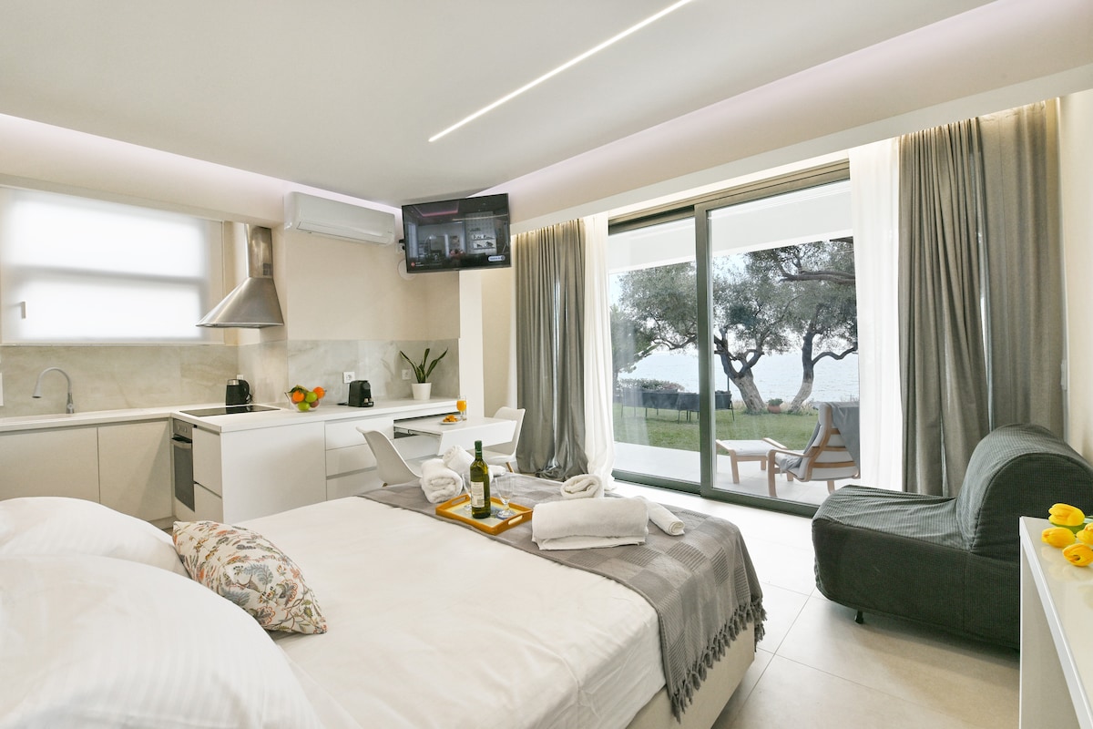 Welcome to our luxurious studio, a peaceful retreat with modern design and carefully curated amenities on Lygia Beach in Preveza, ideal for unforgettable summer holidays for families or groups of adults. The studio is located on the ground floor of a building that also houses 2 other apartments and is just 50m from the sea and the crystal-clear waters.
