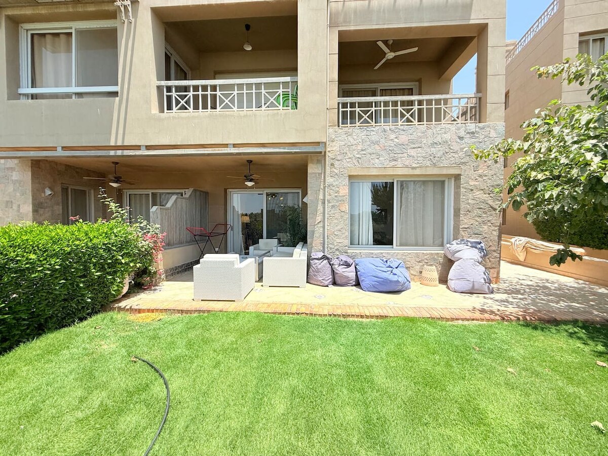 Luxury Golf-View Chalet with Private Garden | Ein Bay Ain Sokhna Luxury 2-bedroom chalet in Ein Bay Ain Sokhna with a private landscaped garden and serene lagoon view. Perfect for golfers, families, or couples seeking a peaceful escape. Enjoy full access to resort amenities including beach, pools, and golf facilities. A premium retreat offering comfort, privacy, and relaxation—just a short drive from Cairo.