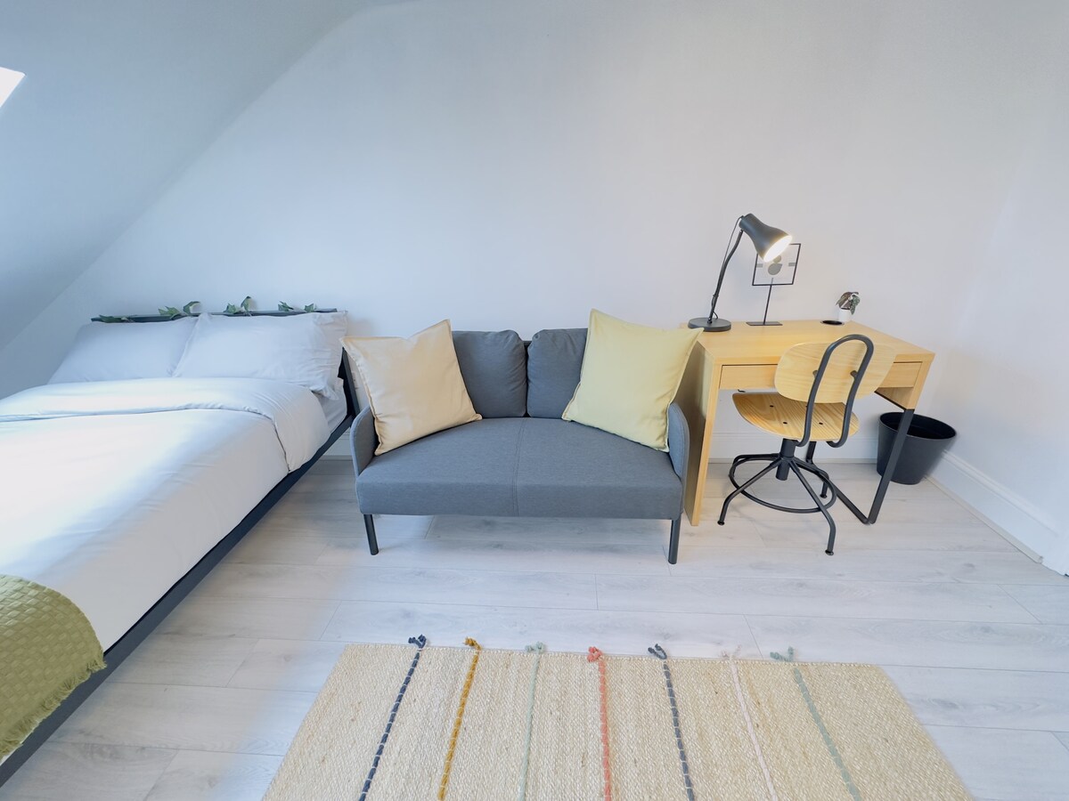 Avatud planeeringuga tuba koos oma vannitoaga, mis asub kaheinimese garaaži kohal. Peamine kesklinna asukoht, kahe minuti jalutuskäigu kaugusel arvukad kauplused, baarid ja restoranid, kümne minuti jalutuskäigu kaugusel raudteejaama suurepärase ühendusega Stansted Airport, London & Cambridge. Kaasas on tee ja kohvi valmistamise võimalus ning külmik ja mikrolaineahi, kuid puudub tegelik köök. Garaaži kõrval on parkimiskoht, mis on tavaliselt vaba. Kui see ei ole tasuta, on vastasküljel tasuline parkimine.