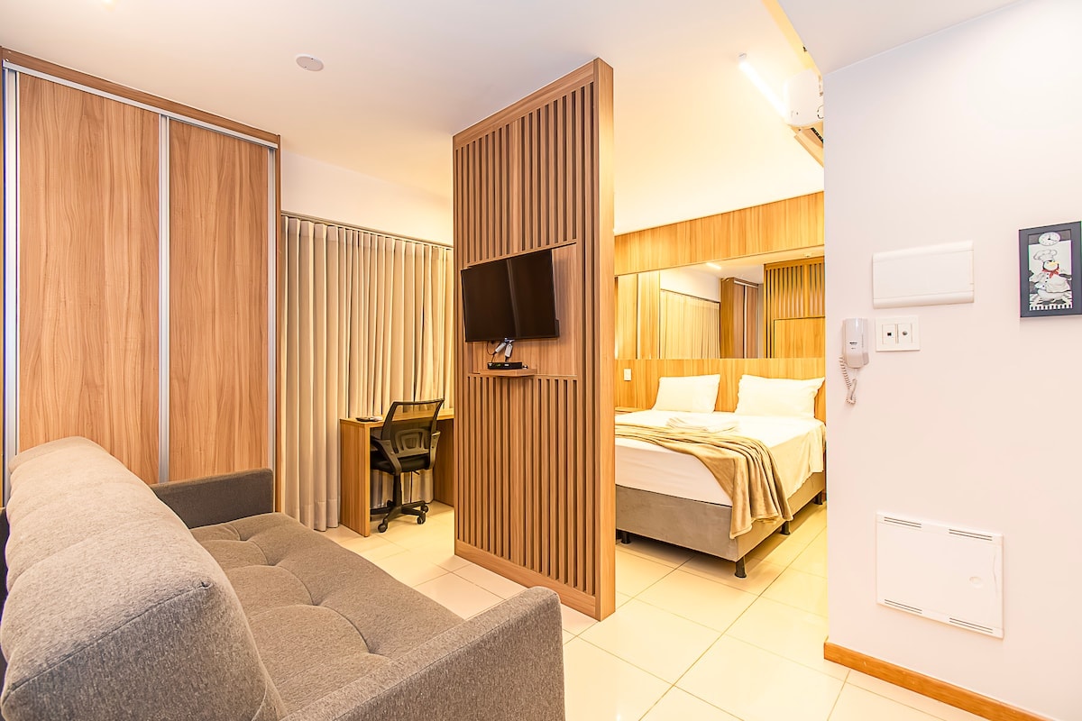 🏡 Studio Térreo – 16m² edelas (Brasília) Kompaktne, kaasaegne ja funktsionaalne. 10 min Esplanada e Aeroportost ja Pão de Açúcari kõrval. Inverteri ✨ kliimaseade, mikrolaineahi, fritüür, kohvimasin, triikraud, võileivamasin, föön, 120 l minibaar ja üheinimesevoodi. Sisaldab 🛏️ 500 mega voodipesu, rätikuid ja wifit. Mõtle oma parimale peatumisele!