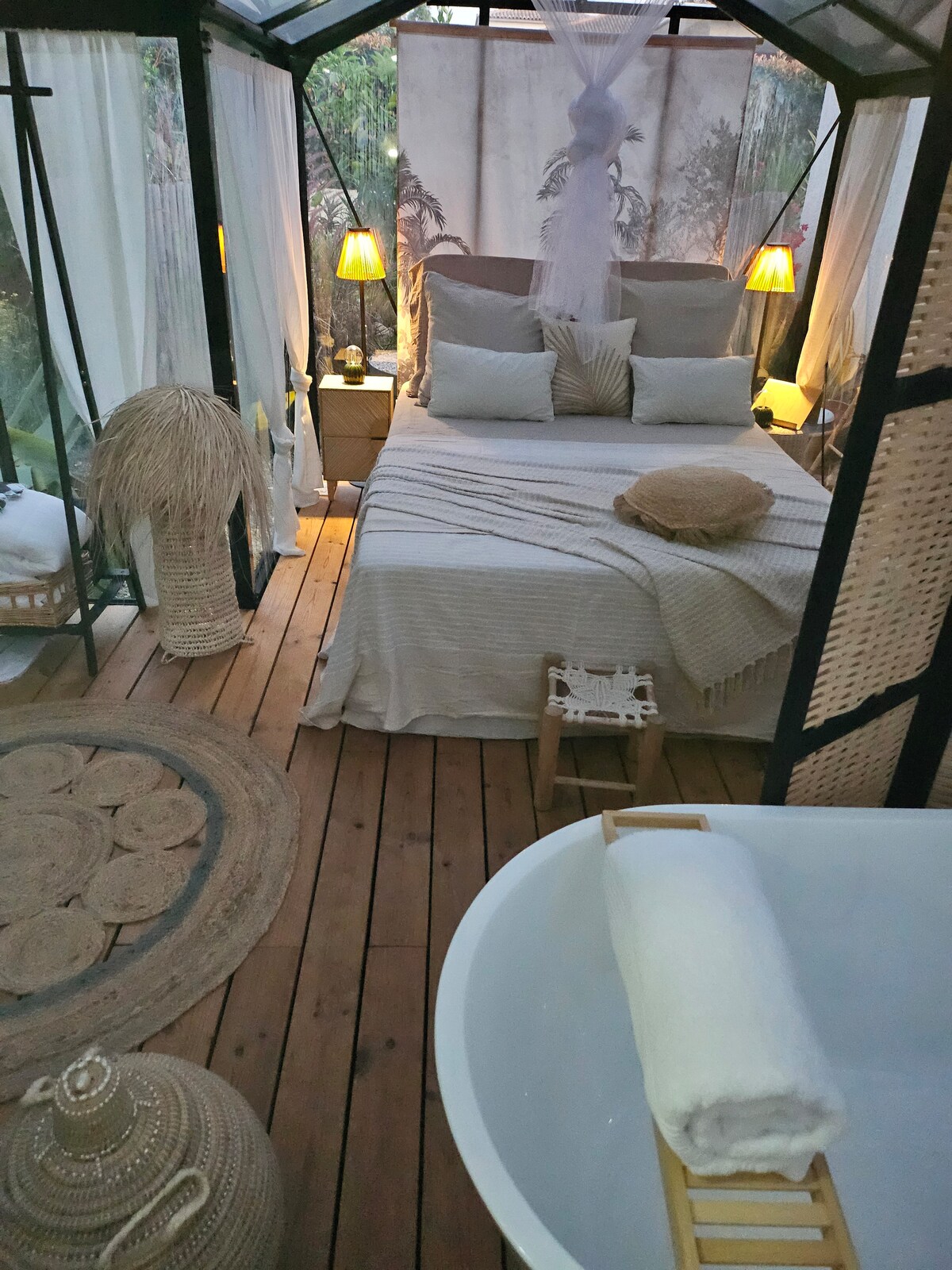 Naudi selle romantilise majutuskoha ilusat keskkonda, mis on täiesti klaasist, sukeldumine lopsakasse aeda... et leida rahu ja rahulikkus Mugavuse tagamiseks varustatud kliimaseadme ja pihustusventilaatoriga Sääsevõrk, minibaar ja kohvinurk Ebatavalise elamuse jaoks... vähem kui 5 km kaugusel lähimast rannast küla ja kauplustele Mullivann massaažis gurmee aperitiiv või hommikusöögikorv on saadaval broneerimisel