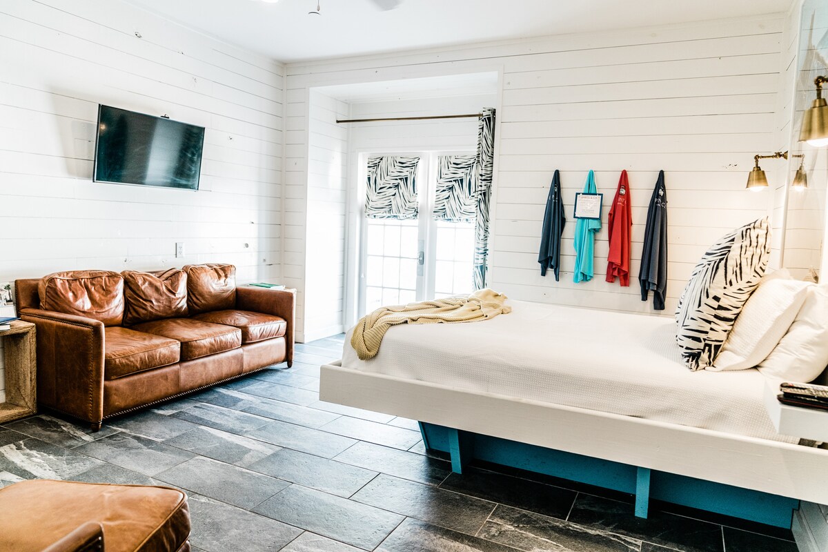 Middle Bay Studio & Loft is a two story studio at Little Point Clear. It's Fairhope's newest and most unique!! Perfect for traveling with kids & pets... or a vacation for two in a spacious, cozy & creatively designed private studio. Private King suite downstairs - Private Queen suite upstairs - perfect for traveling with pets, kids or a couple preferring a bit more space - mini kitchen w/ coffee bar, frig, & dining space - large seating area with leather club chairs & sofa