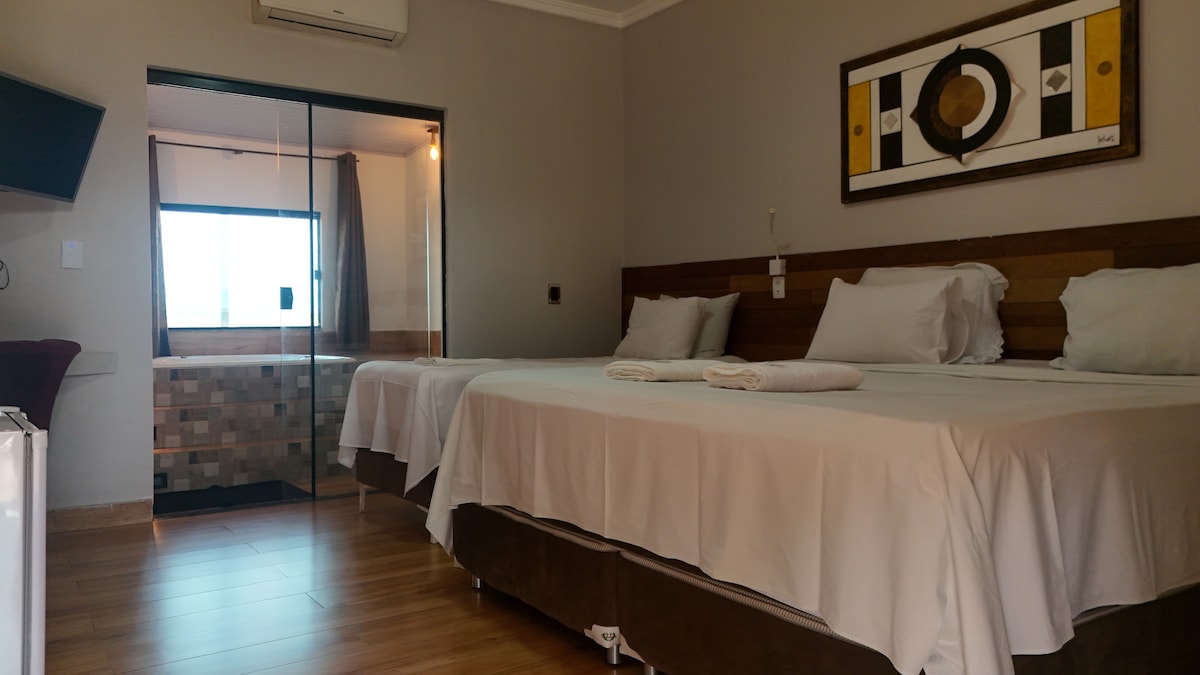 suítes privativas com banheiro com blindex ambiente calmo e familiar temos quarto casal familiar suíte, uma cama de casal e e uma de solteiro , ar condicionado, TV na sala