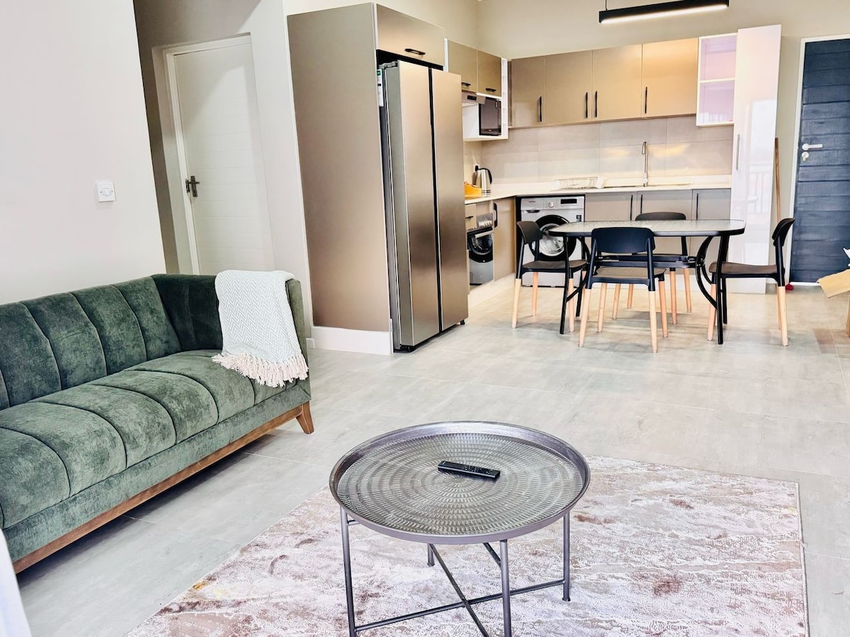 Situated just minutes from shopping malls, restaurants, a hospital, and Sir Seretse Khama International Airport (only 12 minutes away), our apartment offers unparalleled convenience. Designer Beds: Experience ultimate relaxation with our state-of-the-art mattresses and Egyptian cotton bedding. Modern Appliances: Cook with ease using our fully equipped kitchen featuring a dishwasher, fridge, coffee machine, and complete cutlery set.