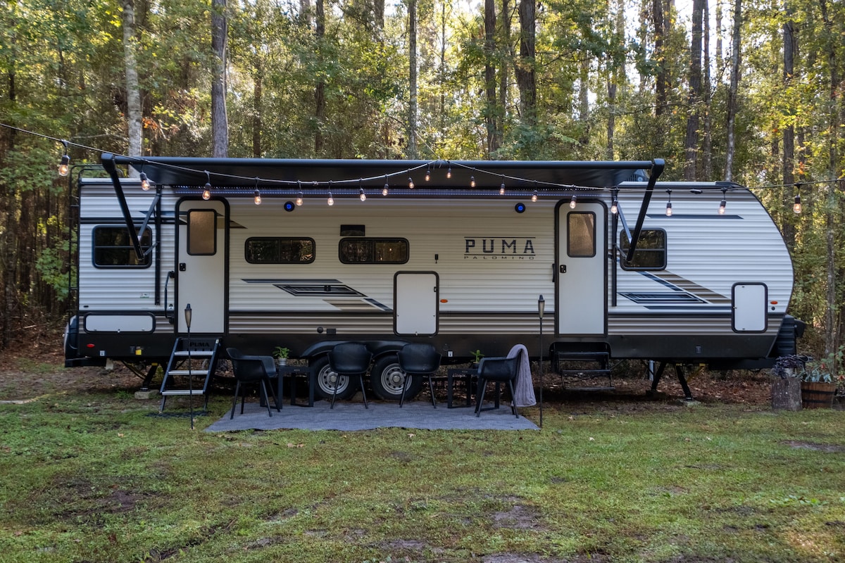 Welcome to Black Lake! Nestled in the heart of a private, tranquil haven, our 2023 Puma Palomino Camper offers a unique and luxurious getaway experience. With multiple lakeside seating areas, you can relax and take in the picturesque scenery, making it a haven for nature loving enthusiasts. The lounge chairs, hammock, and aluminum glider swing provide the perfect spots to read, nap, or simply soak in the serene ambiance. This rental is a true gem for anyone seeking a deep connection with nature.