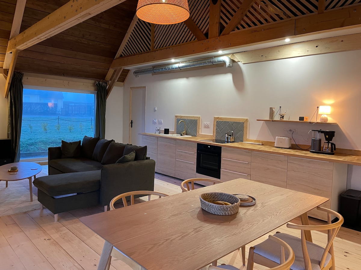 Peidetud pärl Bretagne 'i maapiirkonna südames. Sa astud avatud kööki/puhketuppa, kus on männilaud ja neli tooli. Puhkeruumis on kohvilaud, kaks stiilset pruuni nahast chesterfield diivanit ja seinale kinnitatud nutiteler Netflixiga. Päikesetoas on kahe ühetoalise tooliga palgipõleti. Allkorruse tualett/pesumasin on kommunaalteenuses. Ülakorrusel on 2 suurt magamistuba, kus on super eriti lai kaheinimesevoodid, sügavad madratsid, mis on viimistletud 9 cm sulega kattega.