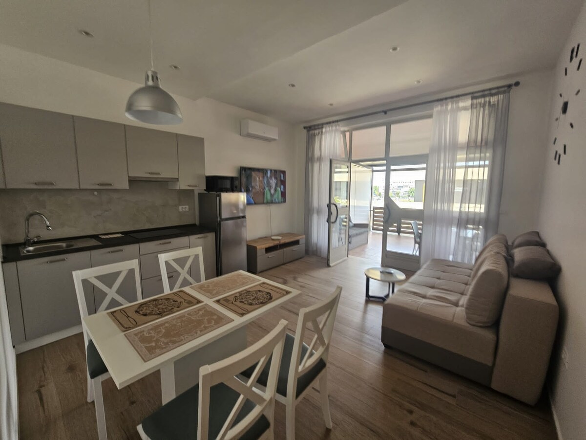 Beautiful, new renovated apartment, with sea view and perfect location. 1km from city center, 800m from most beautiful beaches. The apartment (44m2) consists of large open plan living / dining room with fully equipped kitchen and sofa bed, large bathroom, bedroom with king size bed and large private terrace. Free WI-FI, several international TV channels, air conditioning.