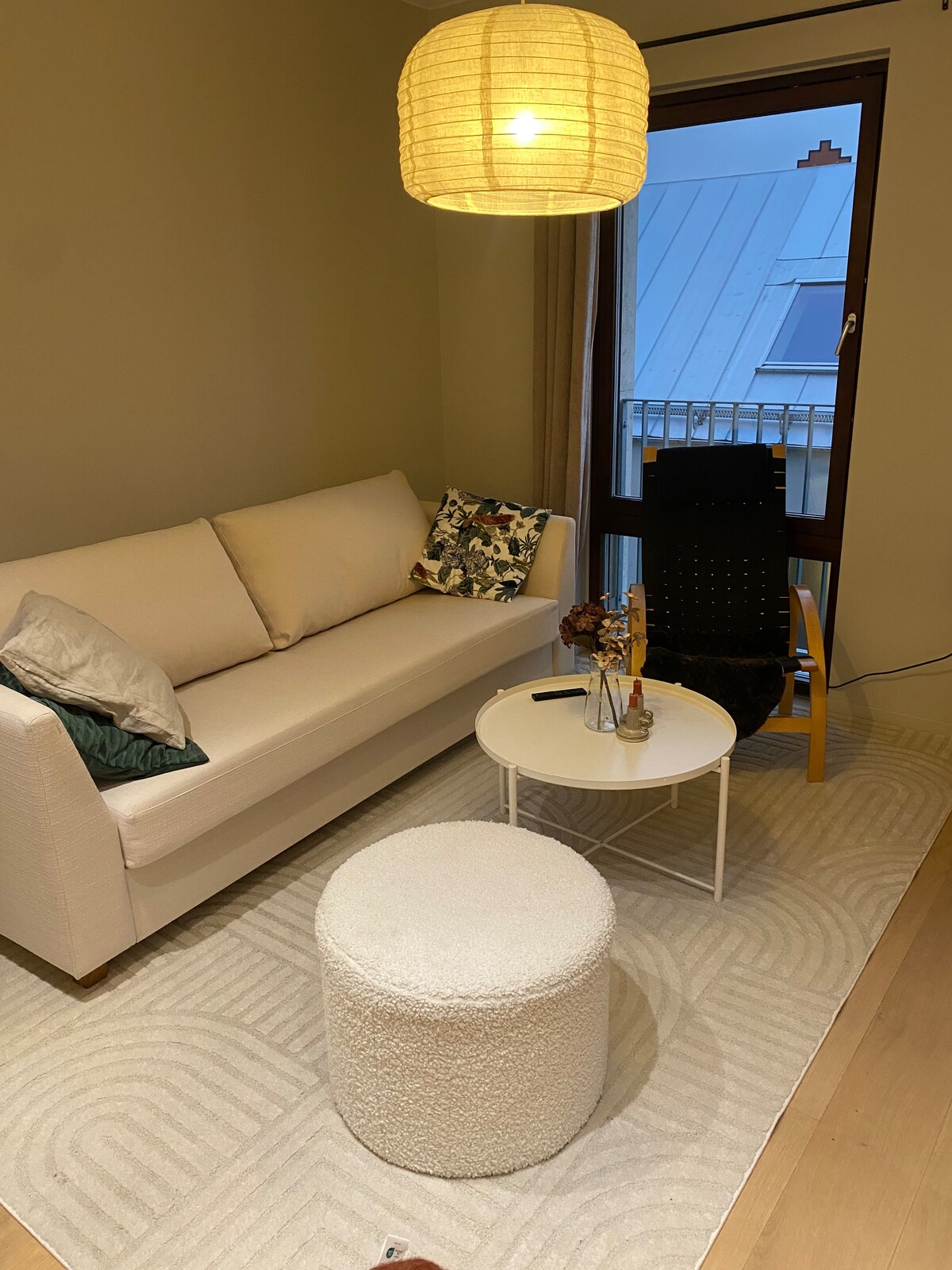 Sovrum: Dubbelsäng (180 x 200 cm) samt klädförvaring. Vardagsrum: Trivsamt vardagsrum med ett mindre matbord med förlängningsskiva och två stolar. Bäddsoffa i vardagsrum: 153 x 190 cm. Observera att den tar upp en stor del av rummet när den är utbäddad. Badrum: Fräscht badrum utrustat med dusch, toalett och handfat. Hall: Hall med spegel och plats för avhängning av ytterkläder. Kök: Fullt utrustat kök med stor kyl och frys, mikrovågsugn, diskmaskin samt induktionshäll med två plattor.