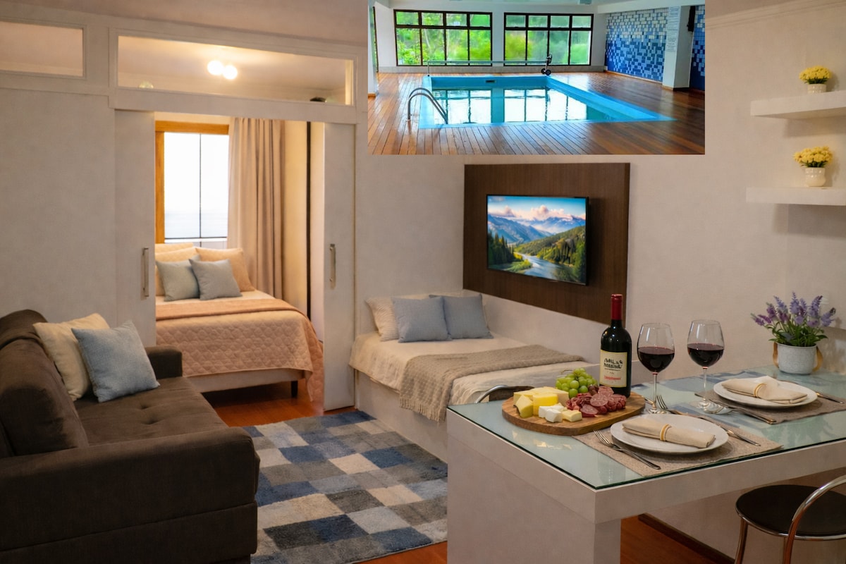 Spectacular Apartment Suite, kus on kaheinimesetuba, elutuba 2 tuba ja köök, kõik kõrgelt sisustatud ja suurepärase vaatega. Moodne, kus on olemas kõik ressursid, mis muudavad peatumise meeldejäävaks, Serra Gaúcha kõige ilusamate vaadete kõrval. Väga roheline, vaba aja veetmise võimalused ja mugavus sinu ümber. Seal on mullivann, ümbritsev valgustus, külmik, mikrolaineahi jne.